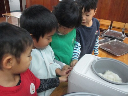 『おもち』です!! 今回は『お餅つき機』を使用したので、 『うす』『きね』などの写真を見たり、 『なぜ、、、お正月におせちを食べるのか』 『なぜ、、、鏡開きというのか』 などのお話、文化、日本のおもちつきの映像などを見ました。 「あー!!見たことあるよー」「お母さんが言ってたー」 「日本でもおもちつきやってたよー」 と、日本の文化の大切さも伝えることができました。 もち米が炊き上がり、機械に入れていきました。 この日のお当番さんが、機械のスイッチを入れてくれます!! 「おいしいおもちになりますよーに!!!」 さぁーエプロンに着替えて、お餅を丸めていきました。 ちょっと、、、 やわらかくなってしまって、、 「わぁー手にいっぱいつくー と、丸めるのも大変な様子もありましたが、、、 しっかり粉もつけて、丸めていきました。 子どもたちも、「おもちのおいしさ**」を知っているので、 大小さまざまになりながらも一生懸命!! いちご、もも組(最年少)も見に来てくれました。 「すごーい!!」「おいしそー」 と、おもちに釘付けになっていました!! さぁー出来上がったお餅は、 『きなこ』『砂糖醤油』を付けて食べました。 一応、、、給食前だからねー^^; と、伝えてましたが 口の周りが白くなるほど、もりもり食べていました。 「ほっぺたがおちそー」と、ごきげんな子どもたちでした。 2月も、さくら組&すずらん組合同でクッキングの予定です^^ どんなものを作るのか、たのしみいっぱいです! (#082) ベトナム・ハノイの日系幼稚園 さくらHoaAnhDao幼稚園ホーページ |