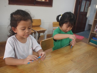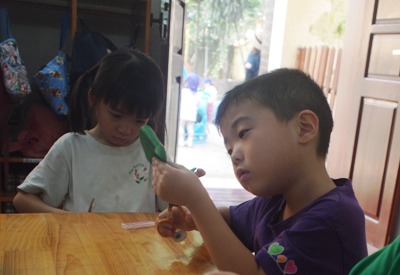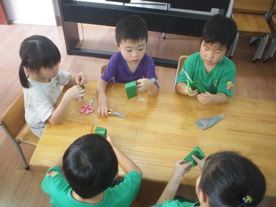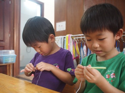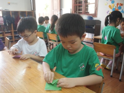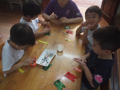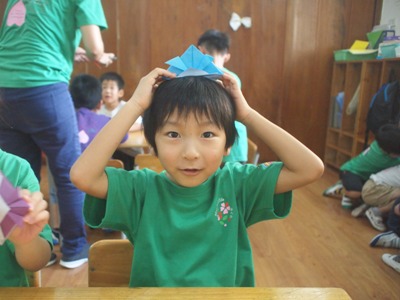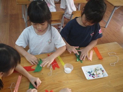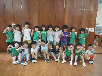 各クラスでは、『やねよぉ~りたかい~♪こいのぼりぃ~』と元気よく歌う声や、 すてきなこいのぼり製作を行っています。 さくら組(年長)も、すてきなかわいい作品ができ上がりました^^ ①折り紙でかぶとを折る 折り紙活動もだいすきで、丁寧にゆっくりと作っていきました。 完成すると、、、あらっかわいい ちょこんと、頭に乗せた姿も見せてくれました ②はさみでこいのぼりを切る 今回は、リボンをこいのぼりの体に見立てて、 しっぽの三角を自分ではさみで切って形を作っていきました。 リボンがひらひらなったり、動いてしまうので、2枚重ねて切るのは少し難しかったですが、、 それでも、「できなーい!」と言うことなく、 お友だちと一緒に取り組んで行きました。 ③ストロー通し さくら組のこいのぼりは、壁に飾ったり、吊るしたりできる製作で、 ストローを使って、こいのぼりがゆれるように作っていきました。 このストローが長いので、毛糸が出てくるまで慎重にゆっくり通さないといけないので、、、 なかなか難しい活動でした。。 それでも、諦めずに最後まで通すことができました。 ④模様つけ 最後に、こいのぼりの目や模様を、ビーズや貝殻を使って、ボンドでつけていきました。 小さなこいのぼりの体でしたが、それぞれのこだわりで、 色々な模様がついたすてきなこいのぼりが出来上がりました。 そして、全員の素敵な作品が出来上がりました^^ 日本から離れたハノイですが、こうやって、日本の文化のよさを実感できました。 (#082) ベトナム・ハノイの日系幼稚園 さくらHoaAnhDao幼稚園ホーページ |