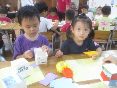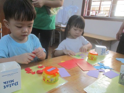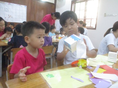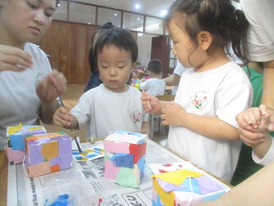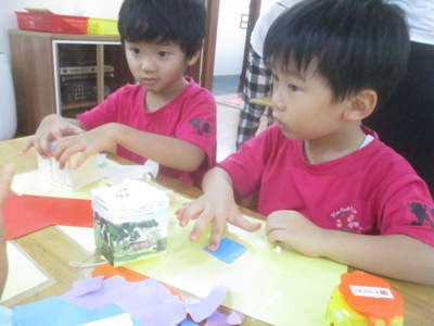 さくらっこみんなで、『風鈴』を作りました。 風にのって聞こえる鈴の音が、とても気持ちがよくて、 作る前から「わーすごい!!」たのしみ!!と言って、わくわくの表情が見られていました。 小さなお友だちと、お兄ちゃん、お姉ちゃん達と、ペアーになり、 活動を始めました。 牛乳パックのところは、画用紙でちぎり張りをして、 素敵に作っていきました。 「つぎはこれ貼る?」「これもあるよ!」 なんて、話をしながら、たのしく作ることができていました。 まだまだ、ちぎるのが難しいお友達は、 お手伝いしてもらいながら、ゆっくり作り、 「どこに貼る?」 「ここに貼ろうか?!」と言って、異年齢での会話も広がり、 優しい心の成長を感じます。 最後は、舌を絵の具で模様を付けて、完成です。 色鮮やかで、個性溢れた、同じものはひとつもない!! 今にも、涼し気な音が聞こえてきそうな風鈴の完成です。 製作の後は、 ホールで運動会に向けてかけっこの取り組みを始めました。 さくら組の勢い溢れる姿を見せてもらい、 「すごーい!!」と、応援するする姿も見られています。 これから、運動会の活動もお知らせしていきますので、楽しみにしていてください! 異年齢で活動することで、さくらっこの絆も深まり、 これからの成長が楽しみになって来ました このさくら組のお姉ちゃんも小さかった時は、 みんなにお手伝いをしてもらっていました。 その時嬉しかった。次は私が!という、気持ちがあるからこそ、 こうやって、小さなお友達を手伝うこと、励ますことができています。 きっと、このお友だちも、やってもらった事は忘れずに、 大きくなった時に、お手伝いできるのだと思います。 さくらっこだから育つ心、子ども同士の関わり、 これからも、日々の成長を大切に、 一人ひとりをしっかり見守っていきたいと思います。 (#082) ベトナム・ハノイの日系幼稚園 さくらHoaAnhDao幼稚園ホームページ |