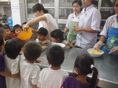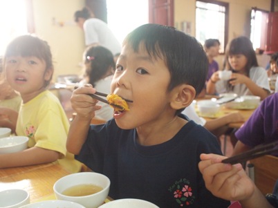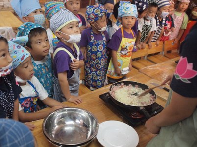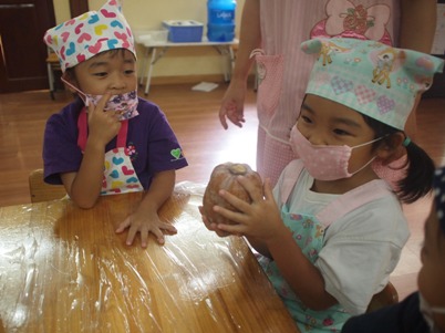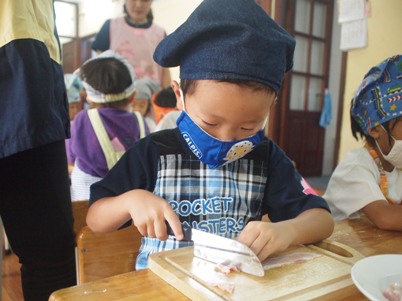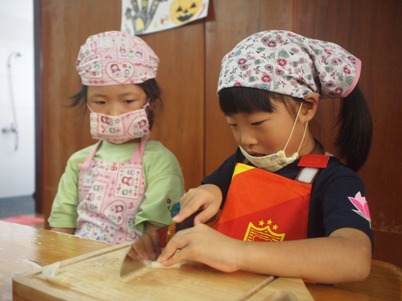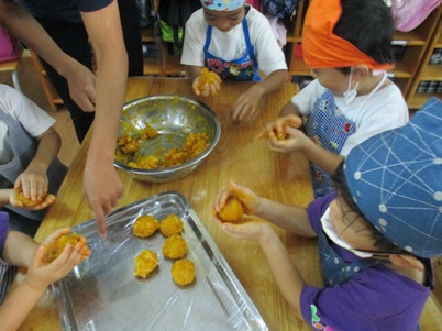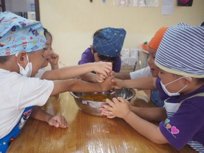 今回は10月と言えばハロウィン!!! ということで『かぼちゃコロッケ』を作りました。 かぼちゃのお洋服は~ と聞くとザワザワ゛ ザワザワ゛ 「かぼちゃのお洋服はみどりいろだよねぇ」「日本のかばちゃは~」と 子ども達の中で意見が飛び交いました。 今回使うかぼちゃは、かわいいサイズで子ども達もにっこり ![]() ![]() かるい ![]() かぼちゃを一人ひとりつぶした後、仕上げはみんなで力を合わせて ![]() ![]() トントントン… 玉ねぎは目にしみる~~~ ![]() ![]() ベーコンを切りました。 包丁の使い方 ![]() ![]() ベーコンとタマネギを玉ねぎを炒めます。 ジュージューの音と匂いで食欲をそそられます ![]() 「お腹すいたね~」の一言にみんなうなずき真剣な表情です ![]() 具材を炒めた後は、みんながつぶしたカボチャ種と混ぜ合わせます。 そして、手で成形していきます。 コロッケ種を手にした瞬間 「やわらか~い」「うわー!」と笑顔いっぱいで嬉しそうな子どもたちでした ![]() とっても楽しかったね ![]() 後は、給食室で衣をつけるところを見学し 給食の先生達に油で揚げてもらいます。 みんなが作ったものが出来上がり、満足気でした ![]() お待ちかねのかぼちゃコロッケ ![]() 中身はホクホク、衣はサクサクとしていて、とってもおいしかったね ![]() ![]() みんなから大好評でした ![]() (おはな) ベトナム・ハノイの日系幼稚園 さくらHoaAnhDao幼稚園ホーページ |