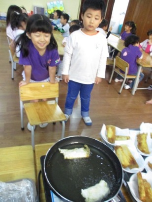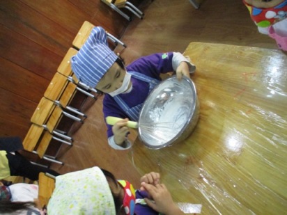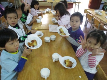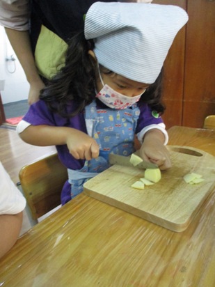 『アップルパイ』 秋の絵本として「しぜん りんご」を読んでいたところ、子どもたちから『次のクッキングはアップルパイとりんごジュースがいい!!』と言う声が。。。 こういった背景があり子どもの気持ちも高まったクッキングでした。 前回、前々回とバナナ バナナとのかたさの違いに、力の入れ加減がなかなか難しく恐る恐る包丁を握る子もいましたが、みんな上手にできました♪ 切ったりんごはフライパンで、お砂糖、お水、レモン汁で煮ます。 一人ひとり切ったレモンに鼻を近づけ顔を『クシュッ』とする子どもたち、、、 カスタードクリーム作りも自分たちで♪ バニラエッセンスの匂いをかいで『いい~にお~い』と幸せそう、、、 出来立ての温かいカスタードクリームを試食!これがクッキングの醍醐味ですね♪ 『おいしい!』『おいしすぎるー!』と予想以上にいい反応 『ベトナム風アップルパイ』と命名していた子どもたち、ベトナムのBO BIAの皮にりんごとカスタードクリームを包んで、自分のものとわかるようにシールを貼り午前中はここまで 温かい出来立てを食べてもらいたく、午睡後ちょっぴり早起きして揚げました やけどしないように少し冷ましてから、『いただきまーす』 子どもたちの笑顔と全員の空のお皿からおいしさが伝わってきました 保護者の中には、クリームを食べきったことに驚く方も クッキングは大切な食育のひとつだなぁと再認識した場でした (ぁゅみ) ベトナム・ハノイの日系幼稚園 さくらHoaAnhDao幼稚園ホームページ |