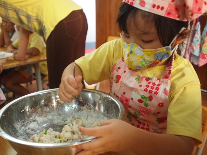 今回は、『だいこんもち』を作りました。 まずは、だいこんのにおいをくんくんくん… 「このにおい知ってる!!」と言って、 子ども達にとっても、身近に感じる野菜の一つのようでした。 しかし、 大根をおろしたことがない子ども達も多くて、 「どうやってやるのー?」と言って、やり方の説明をして、いざチャレンジです☆ 『わー!ちいさくなっていく。』と言って、たのしんで活動が出来ました。 ※大根の水と別にするために、ボールとざるを重ねています。 そのあと、 ベーコン、チーズ、ねぎを小さく包丁で切りました。 包丁さばきも、猫の手も上手になってきましたね!! 切ったものに、大根(水を切ったもの)と、小麦粉を入れて混ぜます。 (少しずつ大根の水も加えます) 『固まってきたー』と言って、グループで交代しながら、みんなで混ぜていきました。 いろんな形に切られている野菜も、それぞれのグループの様子が出ていますね! さいごに、ラップに包んで、一人ひとりが丸めて、 フライパンで焼きました。 焼けていくるいいにおいに… 『あぁー!!おいしそー!!早く食べたい!!』 と、大盛り上がりでした。 そして、給食の時間になり、みんなで 『いっただきまーす!!!』 あちこちで、 『せんせいー!!おいしー!!』 『おうちでもつくって、みんなで食べたい!』 と言って、大満足な様子でした◎ ぜひ、おうちでもつくってみて下さい^0^ さぁー 来月は、どんなクッキングをしようなかーっと、 すでにたのしみな、子ども達でした!! (#082) ベトナム・ハノイの日系幼稚園 さくらHoaAnhDao幼稚園ホーページ |