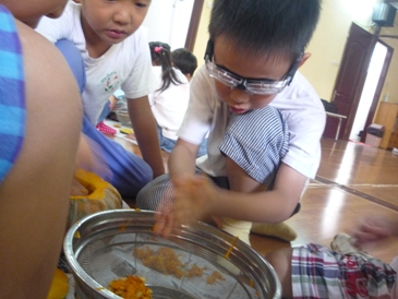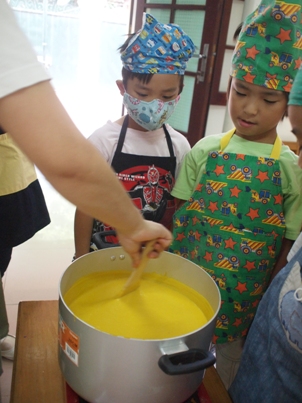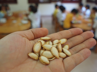 その中のひとつが、ハロウィンです。 この行事にちなんで、今回の年長さくら組の クッキングはかぼちゃのスープ! でも、せっかくの立派なかぼちゃ、スープだけじゃ もったいない!! かぼちゃを、思いきり楽しんじゃいました。 まずは、かぼちゃの下ごしらえです。 かぼちゃの底をくりぬいて、種とわたを取り出します。 みんなで、中に入っていた種の数をかぞえてみると、 なんと 441個 !!今回が3つのかぼちゃを使うので、 それぞれの種の数をかぞえてみたら、441粒、145粒、73粒! かぼちゃによって、種の数がこんなに違うんですね! 下ごしらえしたかぼちゃをレンジにかけてやわらかくしておきました。 うーん、なんだかこれだけでも美味しそう! 今から、中をくりぬいていきます。 かぼちゃの中を、まじまじと見つめる子供たち。 吸い込まれそうだよね~。 今回は、くりぬいたかぼちゃの器を使って、 かぼちゃランタンを作るので、皮が破れないように 子供たちも慎重です。 「きをつけて、気をつけてよ~」と、声を掛け合うのでした。 さあ、出来上がりました!30分かかって、3つのかぼちゃを きれいにくりぬくことができました。 子供たちも、ほーっと一息です。 さっそく、かぼちゃのスープを作っていきましょう ♪ 温めておいた牛乳に、くりぬいたばかりのかぼちゃを加えます。 ここからは、ちょっと省略、少し煮たらミキサーにかけて とろとろのポタージュになりました! 「いいにおいー!」「はやく食べたい~」と テンションが上がってきました。 あとは、塩とコンソメ、バターを入れて、できあがり! さあ!くりぬいたかぼちゃの器でランタンづくりです。 子供たちが、マジックで顔を書き入れて、はさみで 切っていきました。 「うふふふ.......」「おほほほほ~」と笑い声が聞こえて 来そうです。でも、子供たちが書いた表情は、不思議と やさしく、楽しく、うきうきとした表情に見えてきますね。 さあ、お次はおつぎは? じゃじゃーん!!!かぼちゃの種です! ベトナムではナッツ感覚でよく食べられるかぼちゃの種です。 やっぱり、種を捨てたらもったいない。 給食先生にお願いすると、さっそく天日干しをして 次の日に、炒ったものをおやつの時間に出してくれました。 種の殻をうまく割ってみると、中には淡い緑色の実がでてきました。 カリっと食べてみると、香ばしくて自然のやさしい風味が広がります。 給食先生、ありがとうございました! 実は、かぼちゃの下ごしらえをした日に取った種を 子供たちとプランターに植えていたのです。 なんと!! こんな可愛い芽がひょっこり出てきました。 月曜日の朝一番に、「めがでてるよー!」と 興奮した声が園庭に響きます。 かぼちゃひとつでこんなにたくさんの楽しさを 教えてくれたかぼちゃさん。 ごちそうさまでした。♪ ベトナム・ハノイの日系幼稚園 さくらHoaAnhDao幼稚園ホームページ |