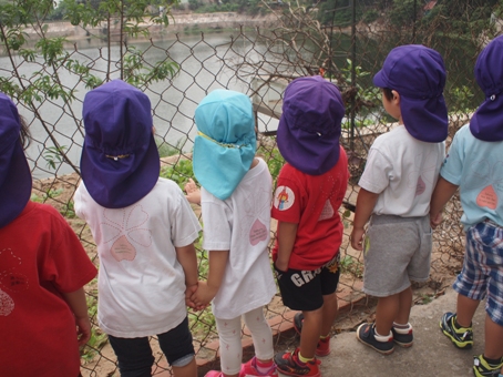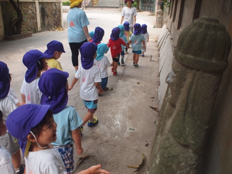 『お友達と手をつないで歩く』 ということが、初めてのお友達もいますので、 遠足の練習(?!)ということで、 いちご組もも組(年々少)と、なのはな組(年少)で 今年度初めての、園外の散歩へ行ってきた。 なのはな組さんは、 「小さなお友達の手を離さないでいっしょに歩いてあげてね。」 と、お話しをして、 「しゅっぱつしんこうえいえいおー!!」と、元気いっぱいに出発です。 民家の軒先に置いてある石像を見つけて 「ここはなにかな?」と聞くと… 「じんじゃー!!」と、渋いことを言うお友達もいました。 子どもの発見や発想は本当に面白いですよね^^ バナナを見つけたり、ちょうちょを追いかけたり、 畑に植えてあるものを見たりして、 最後までしっかり歩き、たのしく散歩に行くことが出来ました。 これで本番の遠足もバッチリたのしめそうです! お土産に黄色い花と小さなぶどうを持って帰りました。 (#082) ベトナム・ハノイの日系幼稚園 さくらHoaAnhDao幼稚園ホーページ |
