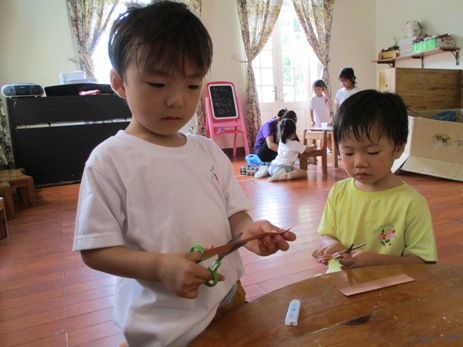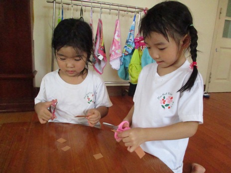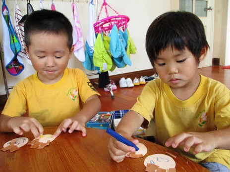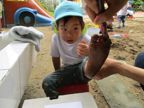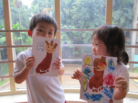 敬老の日製作をしました。 なのはな組(年少)は、足型でみの虫を作りました。 足の裏に、絵の具をつけるのはくすぐったくて、 「くすぐったーい>0<」 と言っていましたが、お友達の足を見て、 「大きいねー!!」 「ぼくのとどっちが大きいかなー!?」 と、友達同士で盛り上がっていました。 みの虫の頭は、はさみでちょっきん~! 「これくらい?」 と言いながら、真剣に取り組む子ども達。 夏休みの間に、はさみの使い方も上手になっていました。 みの虫の顔はクレヨンで描きました。 「どんな顔にしようかな~」 と言って、考えている表情も素敵ですよね◎ 最後に足型の体に顔をのりで貼って完成です! 一人ひとりのかわいいみの虫レターができました。 この子ども達からの愛がたっぷり詰まったハガキは、 さくら組さん(年長)が、今週の水曜日に中央郵便局に行き、 投函してくれます! ベトナムから、子ども達の素敵なハガキが届くのを、 たのしみにしていてください!! (#082) ベトナム・ハノイの日系幼稚園 さくらHoaAnhDao幼稚園ホーページ |