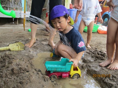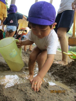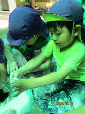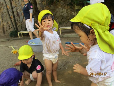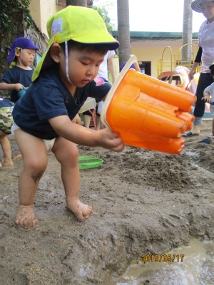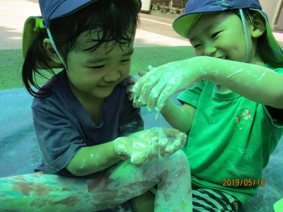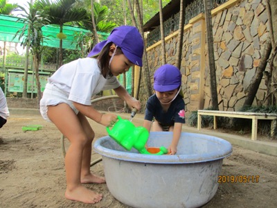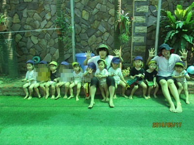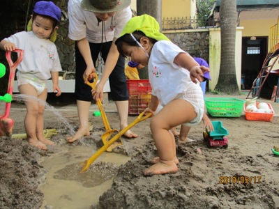 そんな中でも元気いっぱいの子ども達と一緒に「感触遊び」を楽しんだ2日間をお届けします。 この日はお外でブルーシートを敷いて、”タピオカ粉”で遊びました。 さらさらの白い粉に興味しんしん!! まだ触らないよ~っという保育者の言葉をよく聞いて我慢我慢…… まずは、さらさらの状態の粉の感触を味わいます。 片栗粉に似ていて少しキシキシする感触です。 そして、お待ちかねの”お水” 少しずつ少しずつお水を足していくとだんだんトロトロになっていきます。 「うわーどろどろー!」 「きもちいいねー!」 「お団子つくろーっと」 気持ちを言葉に出しながらどんどんと遊びを広げていく子ども達でした。 次の日は、ドロんこ遊びです。 前日から、おうちの方に「明日はどろんこだよー」とお話してもらっていた子どももいたようで(ありがとうございます 朝からとっても暑い日だったので、朝の会を早めに行い、どろんこの絵本を読んでイメージをふくらませ、園庭へレッツゴー! お水をたっぷり桶に用意して、泥んこ遊びスタート! ぞうさんじょうろうやバケツを使って砂場を掘ってつくった穴にお水を流し込みます。 砂の中に隠れていた石を発見したり、パシャパシャドロの感触を楽しんだり。 園庭いっぱいを使って楽しみました☆ バケツおもーーーい、、、 どろんこついたよ! 遊びもダイナミックになり、泥の中でカエルジャンプを楽しむお友達もいました。 上から下までどろどろどろんこ! とっても楽しかったね。 お母様方、いつもお洗濯ありがとうございます (もぐまる) ベトナム・ハノイの日系幼稚園 さくらHoaAnhDao幼稚園ホームページ |