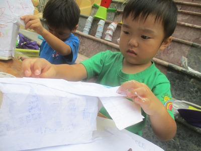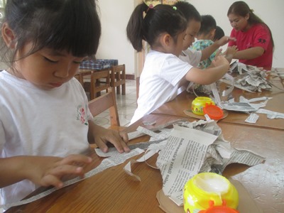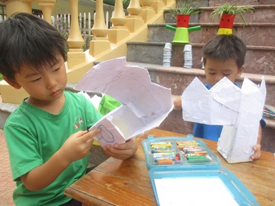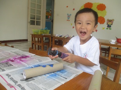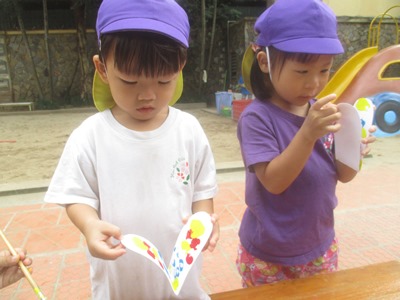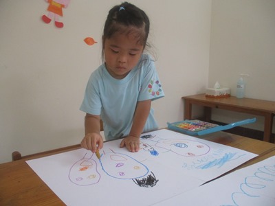 『さくらっこ美術館(作品展)』に向けて、いろいろな活動をしています。 <見てもらう喜び!>を、次は作品で表現して、 自信につなげて、一人ひとりの想いを形にしていきたいと思っています。 運動会の思い出をクレヨンで描きました。 一人ひとりが、しっかりと描きたい想いをもって、大きな画用紙いっぱいに、 ダイナミックに表現しています。 お父さん、お母さんたちが応援してくれてうれしかったこと、 お友達といっしょにがんばったことが、絵の中からも伝わってきました。 秋らしい作品を作り、 とんぼの羽をデカルコマニーで表現しました。 絵の具をトントンとつけ、半分に折ると、 不思議な模様が出来上がりました! 半分に折り、そーっと広げてみる楽しみが子どもたちにも伝わり、 「すごーい!これとこれが一緒になったよー!!」と、喜んでいました。 そして、体の部分は、 スプレーで色をつけました。 「わー!でてきたー」と、教えてくれる大発見の表情☆ 大人も一緒になって、でてきたねー!!と、言ってしまうほどです^^ 日常の生活の中でも、手先を使うこともあるのですが、 製作になると、もっと手先を使ってよく集中して活動を取り組んでいます。 いがくりの製作では、新聞紙を丸めたり、 ちぎって糊ではっていきました。この活動は、はさみも使ったのですが、 線をしっかりとみて、丁寧にすることができました。 ハロウィン製作は、『おばけのいえ』を作っています。 牛乳パックを手伝いながら、子どもたちが切り、白の紙をちぎってボンドでつけていきます。 真剣に取り組んでいるのが、表情から分かりますね。 牛乳パックが見えなくなるまで、張っていきましたよ◎ 白く貼った紙の上に、クレヨンでおばけや、模様を描いていきます。 「これがねー」と、子どもたちの世界を、一生懸命に話してくれました。 涼しくなってきたハノイで、短い秋を感じて、日々過ごしています。 すごしやすいこの時期に、いろんな経験積み重ねていきたいと思います!! こうやって作り上げていった作品は、作品展で飾りますので、 楽しみにしていてください!! ※作品展は12月6日(日)です。また、お知らせします。 |