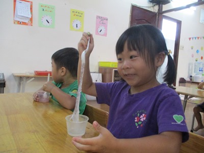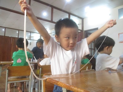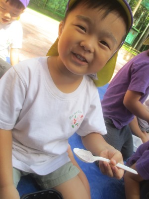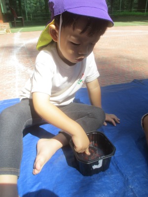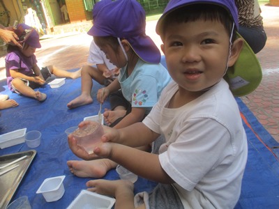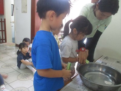 『感触遊び』 涼しくなってきたハノイですが、外で思いっきりダイナミックに遊ぶことは、 子どもたちの気分も解放的になり、気持ちを発散することができます。 <スライム> 水糊、水、魔法の液(ベトナムの薬局で販売している触れても大丈夫なもの) を、カップの中でぐるぐる混ぜていくと、、、 こーーーんなに!!!伸びてスライムの完成です◎ 子どもたちのこの表情!!!>0< 「うわぁぁぁー」と、言う声が届きそうですよね! 「みてみてー」と、びよーんとのばして遊んでいます。 「へびさんがながすぎたーー!!」と、笑い声が響いていました。 <寒天あそび> 寒天作りから一緒にやって、出来上がりを楽しみに取り組みました。 お湯に寒天の粉を入れて、ぐるぐる混ぜていきます。 急いでまぜないと、、、固まってきそうで… 大人は、ハラハラしていたのですが、、 子どもたちは、「わぁーすごい!もうかたまってるよー」と、わくわくいっぱいでした。 カップに入れて、翌日。。。 できたー!!と、とびきりの笑顔で楽しむことができました。 まだ、硬くなってるね!と、ぷるぷるする寒天を触ってみたり、 指を入れて、つめたーい!と、寒天の感触を体験していました。 感触遊びが大好きなお友達もいれば、少し苦手なお友達もいるのですが、 やっぱりみんなでやると、「たのしい!」「みてみて」と、 一緒になって取り組むことができています。 お友達と一緒だからたのしい!の気持ちで、 心も体も大きくなっていってます◎ ※インスタグラムでも、日々の様子が見られますので、そちらもご覧下さい!! |