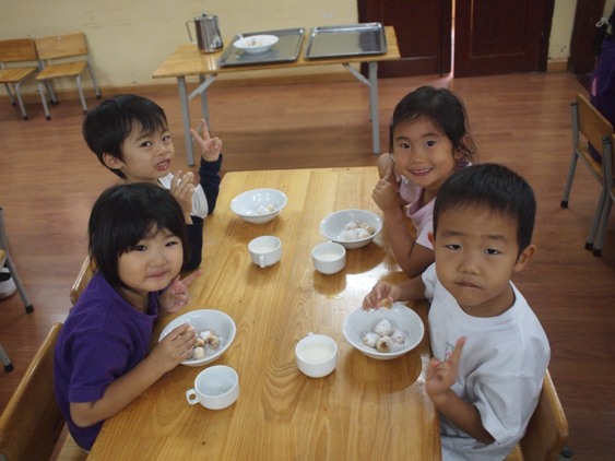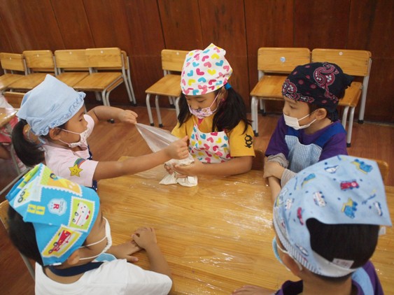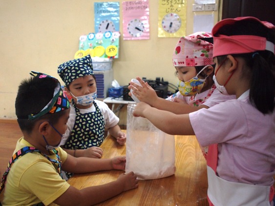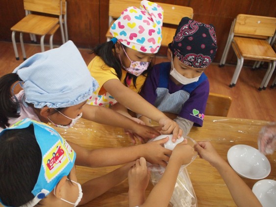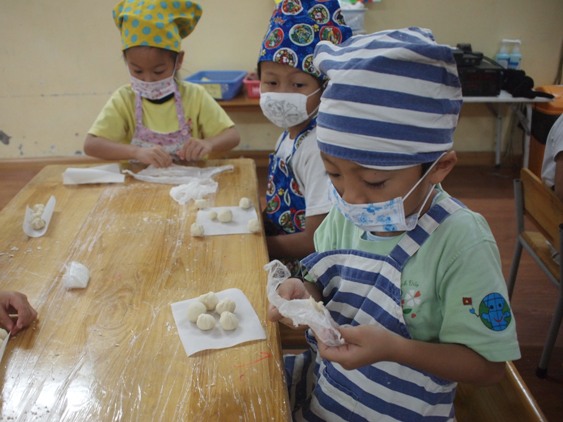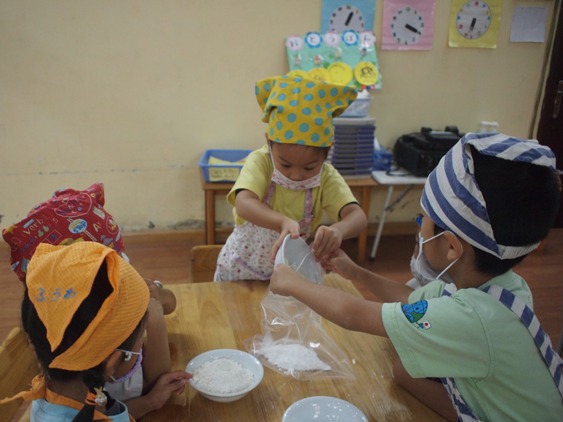 給食で食べるおかず系を作ることが多かったですが、 12月は 「クッキングでクッキーつくりたい!」 という、ちょっとしたダジャレで… クリスマスも近いので、【スノーボール】を作りました。 ①袋のなかに、小麦粉、砂糖、アーモンドパウダーを入れる 小麦粉、砂糖はわかったのですが、 少し黄色い、アーモンドパウダーがわからなくてヒント!! ナッツの仲間で、アー○○○パウダーと、ヒントを出すと 「あー!!アーモンドパウダー!!」と、答えるお友達がたくさんいました。 これで、いつものクッキーよりもやわらかく、 ほろほろしてるクッキーが出来上がることを、お話しました。 グループで協力して、こぼれないように役割分断しながら入れていきました。 こぼれないように慎重です。 「こぼれたら食べるのがすくなくなるよー」 さくら組は、クッキングの時も くいしんぼう発言があちこちから聞こえてきます! ②油を入れる 子どもたちにここでクイズ!これからなにを入れるでしょー 「水を入れる」 「はちみつをいれる」 「豆乳をいれる」 「油を入れる」 と、いろんな答えがでました。 正解を伝えると、 「やっぱりー!!だってお母さんがこの前、お料理の時入れてたよー」 といって、おうちでのことをよく見ていることを話していました。 ③しっかり混ぜる 袋をとじてぎゅっぎゅと混ぜていきました。 「おいしくなれー!!あまくなれー!!」 と、熱い思いを込めていました。 ④丸める 一人ひとりが、ラップの上で小さく丸めていきました。 ここで、ほろほろとして、丸めるのが難しくて、 「こわれちゃーう!!」 「これだったら、クッキーにならないよー」 と言って、苦戦していました・・・。 「わかった!!つよくぎゅっとしたらできるよー」 と、教えてくれたお友達がいて 「ほんとだー!できた!!」 と言って、あっという間できていました。 あとは、焼きあがるおやつまで待ちました。 今日は、お弁当だったのですが、 「おやつになったら、自分たちのスノーボールだよね?」 「ちゃんと、焼きあがるかな?」と言って、 待ちわびていました!! そして、待っていました!おやつタイム◎ 自分たちで、粉砂糖をかけてやっと完成です! 元気よくいただきます。 大きな口でパクリ!! おいしぃー!! といって、いい笑顔でした^0^ 口の周りを白くしながら、 おいしく作って、しっかり食べていた子ども達でした! 次回は、来年の1月です! すでに、何を作るのかたのしみにしているさくら組です! (#082) ベトナム・ハノイの日系幼稚園 さくらHoaAnhDao幼稚園ホームページ |