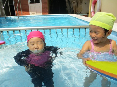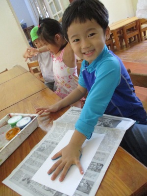 プールのおもちゃで遊んだり、水を掛け合ったり ワニさん泳ぎもとっても上手になりました。 最終日は、全員で入ることが出来ました! また来年入ろうね♪ 9月16日は、敬老の日。 いちご・もも組さんは水風船を使って可愛いぶどうのハガキを作りました。 自分で好きな水風船を選びます。 水風船に、絵の具を付けてぺたん! おてても、ぶどう色だよー。 筆もつかっちゃおーっと! みんなとっても上手にスタンプできました。 ぶどうの房が出来た後は、茎とはっぱをつけます。 いちご組さんは、両面テープを付けたものを先生と一緒にはがしペタペタッ! もも組さんは、自分でブドウ、茎、葉にのりをつけペタペタッ!! とっても可愛くできました。 おじいちゃんおばあちゃん、葉書が届くのを待っていてねー。 (こけし) ベトナム・ハノイの日系幼稚園 さくらHoaAnhDao幼稚園ホームページ |