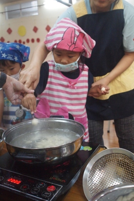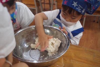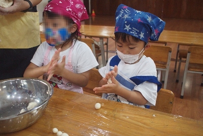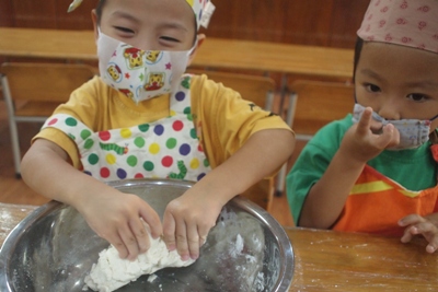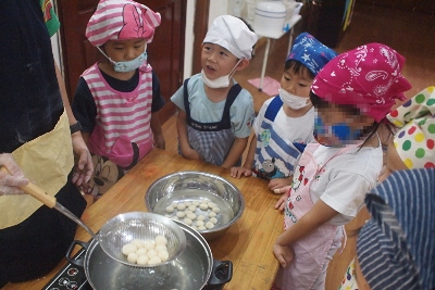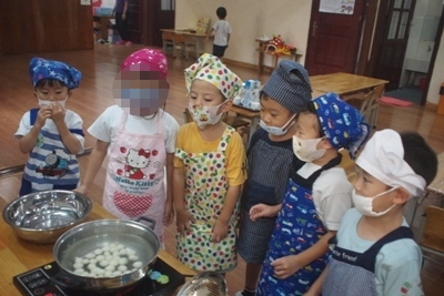 十五夜ということで今回はお月見団子を作りました♪ 前からお月見団子を作ると伝えていたので、 粘土をした時にはみんながお団子を作って練習していた研究熱心なすずらんぐみさん(^^) この日は本当に食べられるお団子作りということで 朝からそのことで頭がいっぱいの子ども達。。 「先生、お団子いつつくるの?」と朝から質問攻めです お昼寝が終わってから作る予定だったので、お昼寝の前に 「作ること忘れてないよね?」と何度も確認、、 お昼寝明けは「クッキングだよ!」というと、 いつも以上にテキパキとお布団を片付けて あっという間にエプロンを着ている子ども達!相当楽しみにしていたようです♪ 始めに豆腐と白玉粉と砂糖を手でコネコネ。。 耳たぶくらいのやわらかさになるまでひたすら真剣な表情でコネコネ。。 「いいんじゃない?」「いい感じ!!」 などと声を掛け合っています♪ 次はお得意のまるめる作業! もう手馴れたものです。 大人顔負けの綺麗なまんまるお団子をたくさん作ってくれました! それではお湯に団子を投入~! 熱いからお湯がはねないようにそ~っと。。 「おいしくなーれ、おいしくなーれ」のおまじないをかけて お団子が浮いてくるのを待ちます。 「お団子ちゃんがんばれー!」 「あともうちょっとで全員浮いてくる!がんばれ!」 と応援していました(笑) 茹で上がったお団子にきなこをつけて完成! 出来立てのお餅を食べて「おいしい!おいしすぎるね!」 と目をまんまるにして喜んでいました♪ 全員おかわりをして大満足なクッキングでした! とても簡単にできるし楽しいので是非おうちでもしてみてください! レシピ↓ さくらHoaAnhDao幼稚園(potato) ベトナム・ハノイの日系幼稚園 さくらHoaAnhDao幼稚園ホームページ |