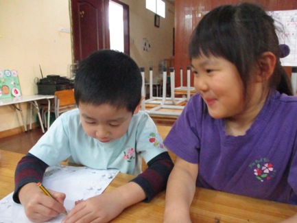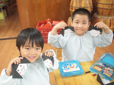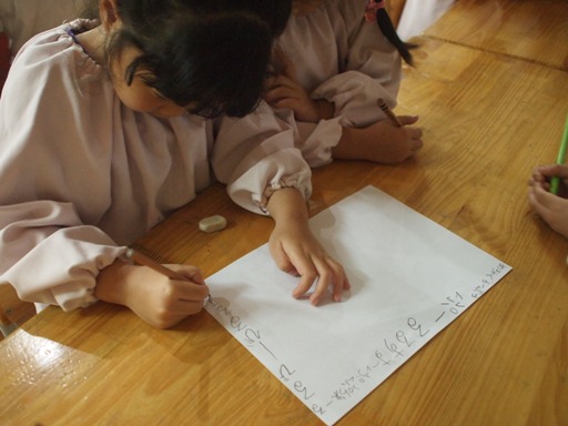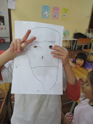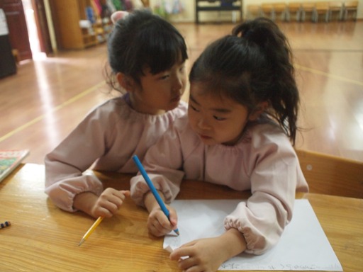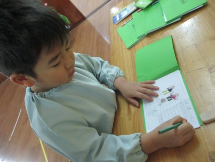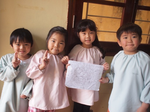 文字あそびの活動をきっかけに、ことばに興味を持ちはじめ、 自分で書けて、嬉しい気持ちも育ち、自信もついてきました。 <あいうえい表>を見ながら、 クラスでお手紙を書いたり、文字を書きながらしりとりあそびなども、 楽しんで活動しています。 お友達同士で、教えあう姿も見られています。 しりとりの内容([るびー→びーる]もぉーまた、[る]になっちゃったー) が面白くて、お友達同士で笑ってたのしんでいます! こんなにたくさん書くことが出来ると、 子どもたちも嬉しくて、 「みてみて!!こんなにできたよー」と言って、見せてくれました。 最後に、「がいこつ!!」と、絵を描いてお面を作って楽しみました。 また、 さくらぐみの三学期の後半になると、一年生になる心構えとして毎年、 『ちいさないちねんせいノート』という活動が始まります。 絵日記のようなもので、 その日の活動や、楽しかったことなどを、絵や文章で書き、 チェック項目に自分で〇、△、×なども記入します。 ・おしたくはじぶんでできましたか? ・おてつだいをしましたか? ・はやねはやおきをしましたか? ・はみがき、かおをあらいましたか? 小学生になったら、自分で時間割をチェックして 準備をしないといけませんからね。 ちいさないちねんせい効果で、保護者の方からも、 『「お母さん!なにかお手伝いすることありますか?」と、いきなり聞いてきましたよー』 と、おうちで頑張っている様子を聞くことができました。 無理をしないで、 たのしく活動していけるように、先生達からもコメントを書いていきます。 子どもたちは、これも楽しみの一つで、 「先生にかいてもらったー!」 「がんばりましただってー!!うれしい!!」 と言って、さらにやる気になっています。 文字や数字の活動などは、 興味を持たなければ、大人が声をかけてもなかなか進まないものです。。 子ども達が少しでも、『やってみよう』という気持ちが持てるように、 クラスでも、楽しんで活動していきたいと思います! おうちの方でも、ご協力して頂きありがとうございます。 (#082) ベトナム・ハノイの日系幼稚園 さくらHoaAnhDao幼稚園ホーページ |