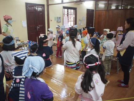 みんなどんなお料理がつくりたい~?? 子どもたちと相談して、みんながだいすきなカレーライスを作ることにしました カレーライスには何をいれるのかな~? 「にんじん! たまねぎ!!」 「じゃがいも! おにく~!!!」 子どもたちとカレーには何が入っているか確認して 楽しくお話してクッキングスタートです 野菜を切っていきます 「ねこのてだよ~~!!」 「きをつけて~!」 子どもたち同士でも声をかけあっていました。 みんなで切った野菜を炒めていきます きつね色になるまでね~と話すと、 「これくらいかな~??」 と言ってみながら作っていきました だんだんといいにおいがしてきました 木べらをもってみんなで順番に交代しながら炒めます さあ つぎは、、、 お水を入れて煮ること15分! カレールーを入れて、 ついに~~~!!! カレーライス完成しました できたカレーを自分でお皿にいれていきます こぼさないように、そ~っと!!! 「すーごくおいしそう~~ さくら組さんの分もみんなで作りましたが、 「つくってくれてありがとう」 「おいしすぎる~ すずらん組さんとってもうれしかったようでした とってもおいしくておかわりでは大行列でした (ジャスミン) ベトナム・ハノイの日系幼稚園 さくらHoaAnhDao幼稚園ホーページ |