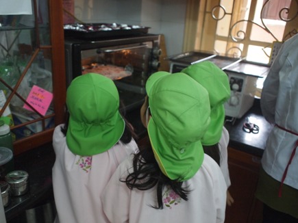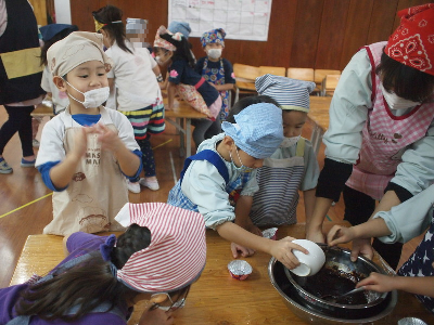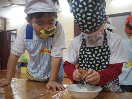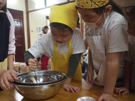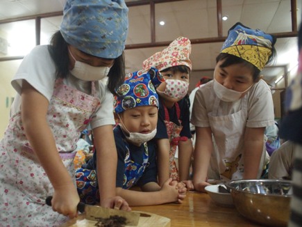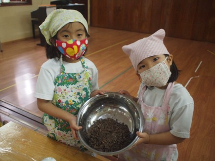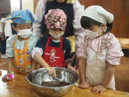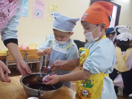 すずらん組(年中)&さくら組(年長)一緒に、 『ガトーショコラ』を作りました。 クッキングは、月に一回ですので とってもたのしみで、みんなでエプロンを着替えてしっかり話を聞いています。 それでは、、レッツ!!クッキングー!!! ①板チョコを刻みます。 ちょっと硬かったので、先生にお手伝いしてもらったお友達もいましたが、 さくら組さんは、「よいっしょ!!」と言って、 力いっぱい刻んでいきました!! お友だちも「おー!すごい」と言って、応援していました^^ こんなに小さくできました!! ②湯銭で溶かし、無塩バター→溶きたまご→砂糖を入れて混ぜていきます。 絶対に水を入れないように、気をつけて丁寧にすること! と、伝えていましたので、、、 どのグループも丁寧にゆっくりと活動することができました。 「ボールがぐらぐらするー」 「ここ持ったらいいんじゃない?」 と言って、お友達で、考えて作る姿もみられました。 「あぁー!!なんかいい匂いがしてきた!!!」 そー言って、 くんくんと鼻を近づけて、においチェックしてました◎ たまごも、上手に割ることが出来ました! ちゃんと、ふたつの手でパカっと割る姿は、 ☆お料理名人☆のようでした^0^ 溶いたたまごをお友だちと協力しながら、ゆっくりと入れていきます。 砂糖を入れて、仕上げのかき混ぜです!! 「おいしくなーれ!おいしくなーれ!」 と、エールを送りながら、みんなで作り上げていきました。 さいごに、自分のカップに入れて完成です! 「わぁーどろどろしてるー」 と、入れるのも大変そうでしたが、しっかりこぼれないように入れていきました。 さぁー!!焼きあがるのを待っていたら… 「なんかいいにおいがするー!」と言って、給食室にお邪魔させてもらって、 出来上がって、膨らんでいくところを見にいきました。 「わぁーすっごーい!!」 「あぁーはやくたべたいよー」 と、喜びの声が広がっていました! おやつになると、いつも以上に準備が早く、、、 「はやくたべようよー」と、張り切っている子ども達>u< 「おいしーこれだったら、5個食べられる!!」 と言って、喜んで食べていました。 両手をほっぺたに当てて、 「おいしすぎるー!!」と、言っていたお友達もいましたよ◎ 自分たちで作ったものは、格別に美味しいようですね** クッキングだけではないですが、 子ども達が四苦八苦しながら、活動しているのを見ると、 ついつい大人が手を出したくなるのですが、 どうやってやっていくのか、 子ども達同士で考えたり、話し合ったりして、 自主的に行動していくのを見守るのも、大人の大事な役割だな。。 と、感じました。 これからも、 いろんな活動を通して、 『やってみたい』『できた』という、 素直な気持ちを、大切にしていきたいと思います。 (#082) ベトナム・ハノイの日系幼稚園 さくらHoaAnhDao幼稚園ホーページ |