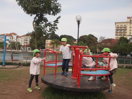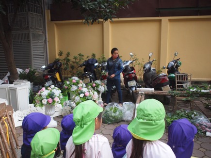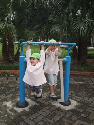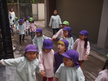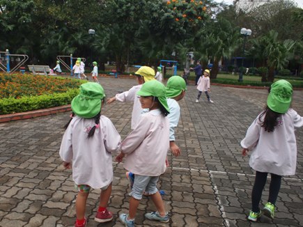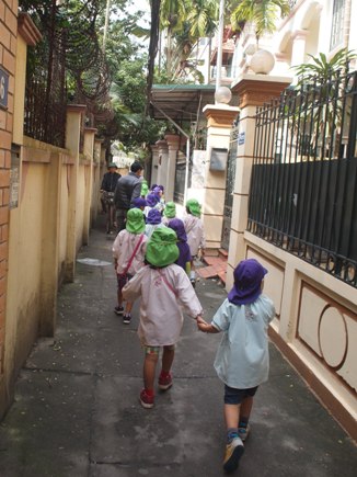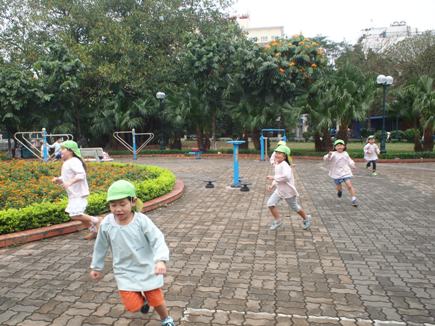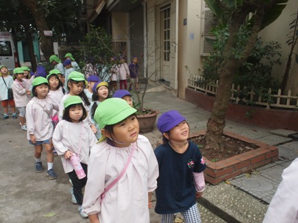 ちょっと遠くの公園まで、すずらん組(年中)さくら組(年長)と一緒に、 散歩へ出かけました。 久しぶりの散歩ですので、子ども達もわくわくいっぱいで、 いろんな発見をしては、その都度教えてくれました。 子ども達が見ている先には、、 木の上にりんごみたいな、丸い実ができていました。 ベトナム人先生に聞いても、わからなかったようで、 「何だろうねー」と言っていました 小さなものを発見するのは、子ども達の方が上手で 「先生みてみて!!」と、教えてくれて 「えーどこどこ?」と探し、一緒に発見できたときの喜びは すごくうれしい気持ちになります。 ここにも何かあったようです! ちいさなみかんの木があり、「ここにもあったよー」 と、教えてくれています! いろんなところに、みかんや金柑の木があるようです。 旧正月の飾りの残りかな? つぎはなにがいるのかな? にわとりを発見しました!! ここはよく通っているので、にわとりがいることは分かっていたのですが、 こんなに多く小屋に入っているのは見たことなく、 「今日はすごいね!!」 「ラッキーだったね」 と、子どもたちも喜んでいました。 巨大ミミズ大発見◎ 暖かくなってきたので、ミミズも出てきたようですね^^ 「うわーすごい!」と、ついつい足が止まってしました。 歩いていると、ちょうどベトナムの結婚式の準備をされているようで、 きれいなお花を見ることができました。 こうやって日本ではないこと、異文化に触れることができ、 子ども達はたくさんの経験をすることができています。 細い路地を通り、、 すずらん組とはここでお別れして、公園に向かうさくら組。 手をしっかりつないで、みんなで気をつけて歩いていくと、 「あっ!ここいったことあるよー」 「ここのアイスクリーム屋さんおいしいよねー。」 「でも、今お金持ってないねえー。残念」 と、なんとも大人のような会話をしている子ども達です! 公園の途中に、お寺がありみんなでお参りをしました。 「みんなが元気に遊べますように!」 さぁー! 公園は目の前です◎ *先生の見えないところでは遊ばない! *安全に気をつけて、お友達と譲りながらなかよく遊ぶ! などのお約束をして、しっかり遊ぶことができました。 近くに住んでいるお友達も多いので、ここの公園には来たことがあったお友達もいて、 「こうやって遊ぶんだよ!」と、話してくれました! 大型遊具もあるので、子ども達はすごく喜んで遊んでいました^^ なかよしのお友達と一緒に遊ぶと、自然と笑顔があふれてきますよね! ぐるぐる回して遊んでいたお友達。。。 「めがまわるよー」と言って、大きな笑い声が響いていました。 遊具から降りた時には、ふらふらになっていて、、笑ってしまう姿もありました^^ ハノイの公園には、 いろいろな健康器具もあり、安全にたのしく遊ぶ姿もありました! たのしく遊んでいる姿がよくわかりますね。 最後には、みんなでどろけい(集団遊び)をして、しっかり体を動かして遊びました◎ みんなでひとつの遊びを楽しむことも大好きなさくら組^^ 「ここが牢屋にぴったりだね」 と言って、子ども達が決めて遊びを始めていました。 いつのも園庭よりも広いので、しっかり走って遊ぶことができました! なんだか、以前よりも一人一人が走る早さも速くなっているように感じて、 成長を感じることができました。 帰りもお寺によって、 「元気に遊ぶことができました。ありがとうございました」 「また、みんなでいっしょに遊ぶことができますように」 と、神様にお願いしました。 帰り道でも、 「たのしかったねー」と言って、充実した様子が見られました。 幼稚園に着くと、元気な「ただいまー」と言う声が、園庭に広がりました。 行事が続いていた三月でしたが、この日は、 子ども達の笑顔が、ハノイの空に広がった一日になりました。 子どもたちの中でも、この日もきっと、 素敵な思い出になり、宝物になってくれたと思います。 さくら組は、残り少ない園生活ですが、最後まで楽しんで過ごしていきたいと思います。 (#082) ベトナム・ハノイの日系幼稚園 さくらHoaAnhDao幼稚園ホーページ |