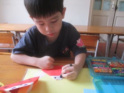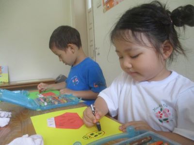だんだん蒸し暑くなってきたハノイで、子どもたちとこいのぼり製作をしました。 (すっかり投稿が遅れてしまいました・・・。) 園庭には今年も大きなこいのぼりが飾られていて、そのこいのぼりを見ては、 「ふくらんでる!!」「およいでるよ!!」「きょうはおよいでないね、、」 と教室から見えるこいのぼりを日々観察?!している子どもたちです さくら、すずらん組は、つくる形は一緒ですが、クラスで技法をかえてとりくみました。 最初は合同で、こいのぼりの目や体となる部分をハサミで切りました。 ハサミで切る顔も真剣そのものです!さすが幼児組さんですね そして、折り紙を使って、かざぐるまもおりました。 完成して、子どもたちもとっても嬉しそうですね!! さぁここからはクラス別の活動です。 まずはすずらん組。 白いクレヨンで紙に絵や模様を描き、その上を絵具で色をぬる、はじき絵に挑戦です。 初めは白いクレヨンで描くことに少しハテナ????の子どもたちでしたが、絵具をつけてみると模様が見えてくるのをみて驚いていましたよ。 さくら組は、黒いクレヨンで鱗を描きました。 実際にこいのぼりをみながら描いていきましたよ。 描いたうろこに絵の具のパレットを使って一枚一枚丁寧に色をぬっていきました。 次はどの色をつかおうかな??と楽しみに色を付けるこどもたちです。 そして細かいうろこでしたが、集中をほとんど切らすことなく最後まで頑張りました!! さくらぐみさん。 すずらんぐみさん。 こいのぼり会ではこの作品をかざってたのしみます(^^) (きいろちゃん) ※インスタグラムでも、子どもたちの様子がわかります。ぜひ、ご覧ください