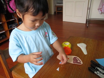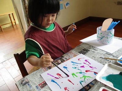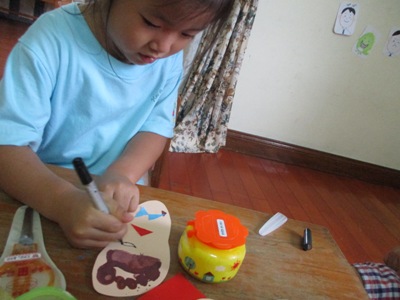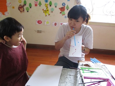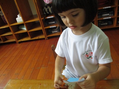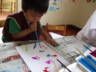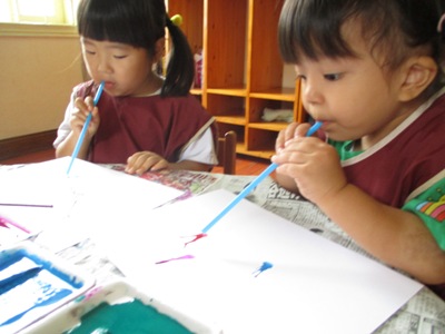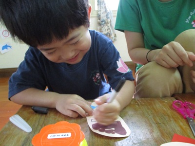 父の日参観にお越しいただき、ありがとうございました。 子ども達からお父さんへのプレゼントがどんな風につくられたのかをご紹介します まずは、小物入れの柄づくりです。 真っ白い画用紙に、ポタリ・・・と絵の具をたらして、 ストローでフーッ!!!! あら不思議!絵の具がスーッと伸びていきます。 3人ずつ行ったのですが、保育者の見本を見て みんなとってもいいリアクション やりたーーーい! の気持ちいっぱいに頑張りました。 「見てみて!手の形みたいだよ!」と教えてくれるお友達もいました。 その後は、園庭で足型を!! 「くすぐったーい!」 とニコニコでペッタンできました。 足型が乾いた翌々日は、足型に目、鼻、口、蝶ネクタイをつけていきます まずはハサミを使って、口と蝶ネクタイを切りっ! 折り紙の角を1回切りしました。 切り取った折り紙をのりを使って貼り付けて・・・ 仕上げに黒ペンで目と鼻を書き込みます。 どんな顔にしようかなぁ。 子どもによって、目の形はそれぞれ どうしてこの顔にしたのー?と是非おうちでも聞いてみてください みんなお父さんへありがとうの気持ちをこめて一生懸命つくることができました! 父の日参観当日、プレゼントを渡した子ども達にも渡されたお父さん達にも笑顔が広がっていました (もぐまる) ベトナム・ハノイの日系幼稚園 さくらHoaAnhDao幼稚園ホームページ |