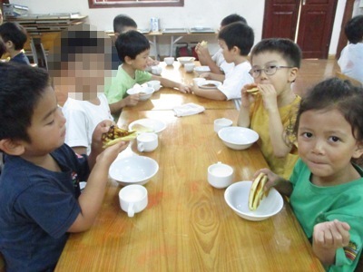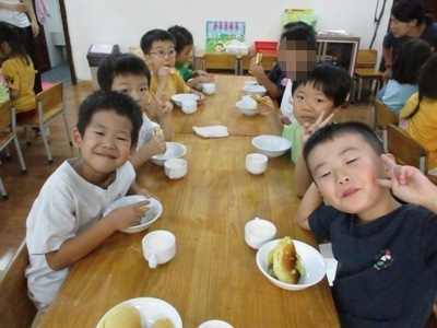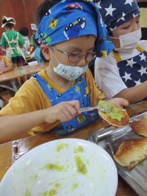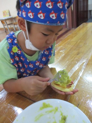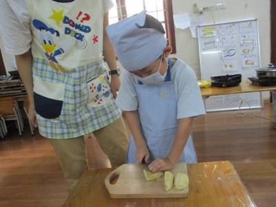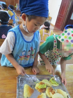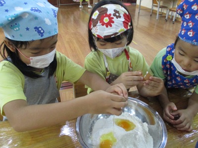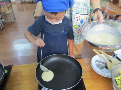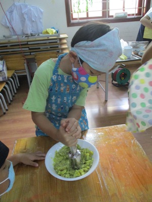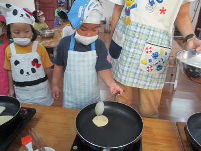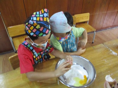 「さつまいもあん どらやき」を作りました。 まずは材料のご紹介です。 生地★ ホットケーキミックス240g 砂糖70g たまご2こ 牛乳200ml みりん30ml 油 あん★ さつまいも150g 牛乳35ml 砂糖40g 塩少々 作業工程を確認し、あんと生地を並行して作っていきました。 まずは、あんの仕込みです。 固いさつまいもも包丁に力を込めて、、、 猫の手でしっかり切っていきます。 さつまいもをお鍋で茹でている間に生地作りです。 ボウルに 粉、卵、砂糖 を入れていきます。 そーっとそーっと。 卵も上手に割れました! そこへゆっくりと生地の状態を見ながら牛乳とみりん!を加えていきます。 そしたらよーくまぜまぜまぜ。 さあ、いよいよ生地を焼きます。 フライパンを温めて、 おたま半分ほどに生地を入れたら トローっと流し込みます。 そーーーっとね。 焼いている間にまたあん作りに戻ります。 湯だったさつまいもをしっかりめん棒で潰して 牛乳、砂糖、塩を入れて優しくまぜ、少し加熱します。 さあ、出来上がった生地にさつまいもあんを詰め込んで、、、 つめつめ。 いっぱいいれよーっ できあがりー!!!! おいしーっい!! にこにこがあふれます。 特大の「さつまいもあんどらやき」を味わった子供達でした。 (もぐまる) ベトナム・ハノイの日系幼稚園 さくらHoaAnhDao幼稚園ホームページ |