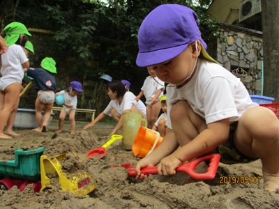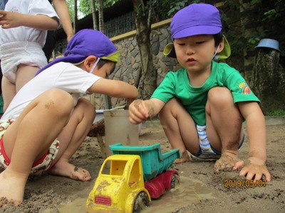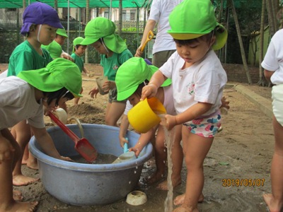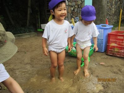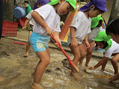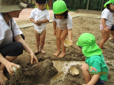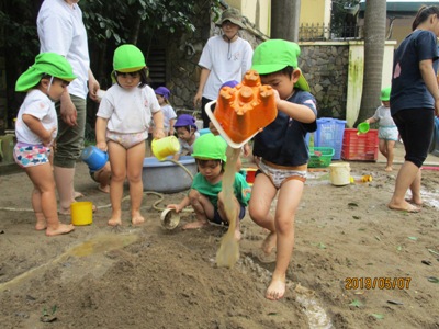 爽やかなお天気の中、もも組なのはな組合同でどろんこ遊びを行いました。 前日に、「明日はどろんこ遊びだよー!」と伝えると目を輝かせる子ども達。 朝からワクワクです 園庭に向かうために、お教室で準備。 ズボンを脱いで、靴下脱いで・・・ 裸足のまま階段を下ることにドキドキ 裸足で園庭に出ることにもドキドキ (くつ箱で靴を履く事がちゃんと習慣になっていて、 くつ箱で外靴を手に取る可愛らしいうっかりさんもいました いざ、お砂場へ!! 「ひゃーきもちいい!!」 と、素足だからこそ感じられる砂の感覚に声をあげる子ども達。 先生達にお水をお砂場にかけてもらって、レッツ!どろんこ!! パシャパシャ ジャーーッ 川だ~!! よいしょ よいしょ じゃぶじゃぶ お山だ!池だ!! もっともーっと、お水をいれよう! ドロを運ぼう 遊び方は、子どもによってそれぞれです。はじめはおっかなびっくり 体をたっぷり使って動いたこともあり、お昼寝はいつも以上にぐっすり~ ないちごもも組、なのはな組でした。 (もぐまる) ベトナム・ハノイの日系幼稚園 さくらHoaAnhDao幼稚園ホームページ |