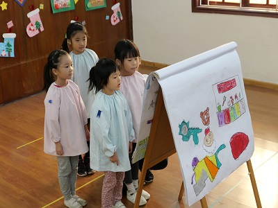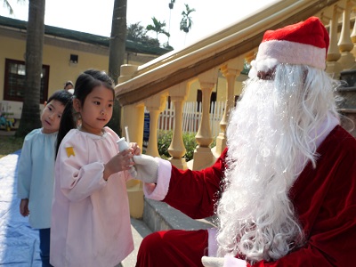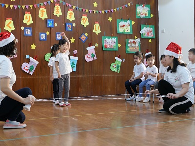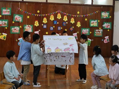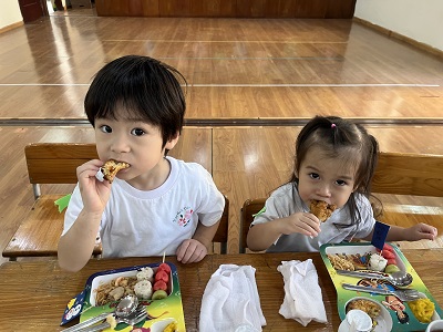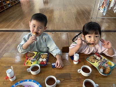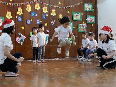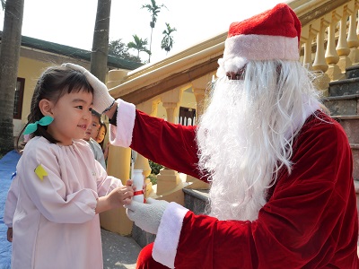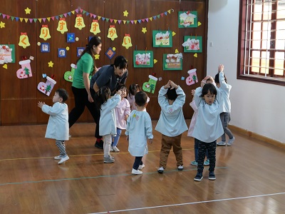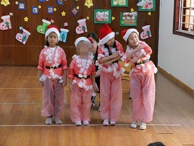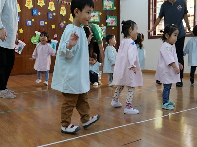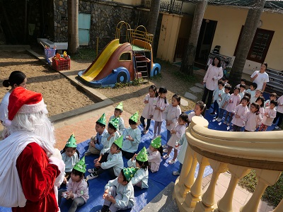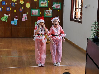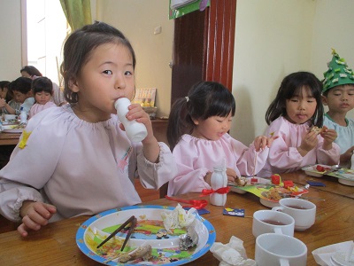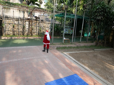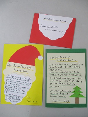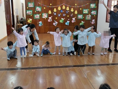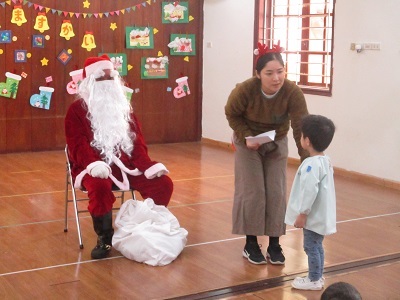 今日はホールの中もクリスマスの雰囲気に様変わり!!!♪ 朝からルンルンの子ども達です。 子ども達にクリスマス会の由来についてお話をしたり、歌を歌ったりしました。 そのあとに、クラスごとに発表をしました♪ ~なのはなぐみ【なのはなサーカス団】~ 元気に入場し、 まずはゴム跳び!元気にお返事することもできましたね☺ 次は、跳び箱を披露してくれたお友だち! 拍手をたくさんもらえてうれしかったね♪ 鉄棒を披露してくれたお友だちは、豚の丸焼きや足かけまわりを見せてくれました!!! 最後は、なんと!組体操!!! 憧れのさくら組さんのようにできていましたね☺ ~いちご・ももぐみ【クリスマス遊び】~ ピアノの音に合わせてロケットやペンギンに変身したり、 元気いっぱい体を動かしていました! 子ども達も楽しくて自然とにこにこ笑顔に・・♪ 可愛くて、見ているお兄さん・お姉さんたちの表情もニコニコでした☺ ~さくらぐみ【サンタの国のおはなし】~ この日に向けて、みんなでストーリーを考えたり紙芝居づくりをしてきたさくらぐみさん。 ちょっぴり緊張していましたが大きな声で、お話を読むことが出来ました☺ 紙芝居の絵は2人1組になって描きましたよ♪ ~すずらんぐみさん【なんか違うよサンタさん】~ すずらん組さんサンタさんが可愛い衣装に着替えて登場です! 次に登場してきたサンタさん。 あれあれ??なんか違うところがありますね…! そう!洋服の袖が違います・・! ♪なんかちがう~なんかちがう~♪ね~ね~違うよサンタさん~♪ のお歌はほかのクラスのお友だちも口ずさんでいました☺ 最後はサンタさんみんなが出てきてみんなでハイポーズ! 以前、子ども達がサンタさんにお手紙を出しており、 サンタさんから”クリスマスの日に会いに行く”との返信が来ていました! すると・・・ ベルの音とともに、さくらHoaAnhDao幼稚園に サンタさんが!!!!! 「サンタさんだ」「やったー!」と大喜びの子ども達♬ 前にサンタさん宛てに出したお手紙の質問にも答えてくれました! 「なんでトナカイは飛べるんですか?」 「好きな果物はなんですか?」などなど・・ そのあと、1人1つずつ”魔法のジュース”のプレゼントももらうことが出来ました♬ 「ありがとう!!」「センキュー!」とお礼もできました☺ サンタさんがサンタの国に帰るときには、 「また来てね!」「ありがとう!!」と元気にご挨拶もできました☺ また来年も来てくれますように・・・♪ ~お楽しみランチ【サンタが街にやってくるよランチ】~ を食べました! 子ども達の大好きなメニューが詰まっています♪ 「おーーーーーいしーーーい!!!!」 全部食べた後は、お楽しみサンタさんからもらった”魔法ジュース”を飲みました! 大きいクラスのお友だちが、お手伝いをしてくれましたよ♪ 「あまくておいしい~!」と笑顔が溢れます。 おやつのクリスマスケーキもおいしくてペロリと食べていました♪ 1日通してクリスマスの雰囲気を味わい、特別な1日を過ごすことが出来ました☺ (♪) ※インスタグラムでも、幼稚園の様子を日々の様子を見られますので、そちらも是非ご覧ください。 ベトナム・ハノイ初の日系幼稚園 さくらHoaAnhDao幼稚園 |