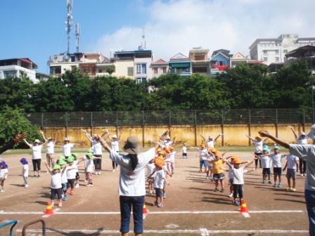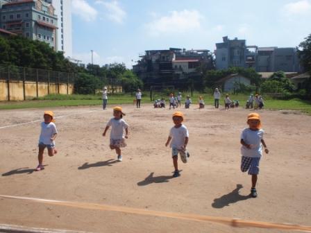 前回は、残念ながら雨で中止になってしまいましたが、 今回は、しっかり晴れて、グランドに行くことが出来ました!! 広いグランドで、「ここでするの~?!」 と、わくわくの子ども達でした。 まずは、入場行進です。 さすが、最年長クラスのさくら組。 腕しっかり振って、真剣な表情で行進する姿は、とってもかっこよかったです。 続いて、すずらん組、なのはな組とがんばる姿が輝いていました。 最後は、最年少クラスのもも組といちご組。 小さな体で、一生懸命な姿がかわいかったです。 開会式で踊る、《ペンギンパラダイス体操》は、いつも取り組んでいるので 張り切ってやりました。 かけっこは、広いグラウンドで、子ども達ものびのびと走っていました。 各クラスのダンスもはじめて披露できました。 他のクラスのお友だちの声援や、曲に合わせて一緒に踊る姿もあり、 みんなで楽しんでいる様子がみられました。 さくら組の組体操は、はじめて外で取り組んだこともあり、砂が服や手につくことを気にしてしまったり、暑くてくたびれてしまう子どもたちもいましたが、 最後にさくら先生から「それが組体操であり、みんなで気持ちを一つにすることが大切なこと」だとお話しがあり、子ども達も気持ちを切り替えて、がんばることをみんなで話しました。 そして今回は!! たのしみにしていたお弁当の日。幼稚園に帰って、笑顔いっぱいでお弁当を食べました。 朝も早くから、お弁当作りや、グランド登園のご協力ありがとうございます。 来週も、しっかり汗を流し、がんばりたいと思います。 ベトナム・ハノイの日系幼稚園 さくらHoaAnhDao幼稚園ホームページ |