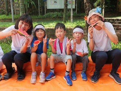会話を楽しみながら、洋服に着替えて顔を洗います♪ ◎ラジオ体操 ラジオ体操係さんが前に立って、みんなで体操をしました! 昨日までの雨が嘘かのように青空が広がり、とても気持ちが良かったです☺ 最後に王冠のスタンプをもらうことができました! ◎朝食 みんなで手作りのサンドイッチを作って食べました。 いつも一緒に遊んでいるすずらん組から、 お花とメッセージボードのサプライズプレゼントをもらい、ホッコリ♬ 特製サンドイッチおいしくできるかな? この2日間は、給食・事務のスタッフにお掃除さんなど、職員全員が子どもたちと一緒に過ごします♪ 皆で食べるごはんは美味しいね(^^♪ ◎すいか割り すいか割り係さんに「1.2.3.4.5!」と数えてもらいながら、ぐるぐるまわります まずは先生が見本を見せてくれましたが、フラフラフラ~立つのがやっとです・・ 子ども達も挑戦!!! 見事にすいかに当たって集まってきた子ども達☺ 最後はみんなで美味しく食べました! ◎絵日記 わくわくさくらぐみの最後は、”わくわくさくらぐみで楽しかったこと”を絵日記にしました。 お化け屋敷が怖かったことや、キャンプファイヤーのことなど、、、2日間の思い出を一生懸命文字と絵で書いていた子どもたちでした! この2日間、お友だちや先生・スタッフみんなで目いっぱい特別な時間を楽しむことが出来ました♪ この特別な2日間をいつまでもいつまでも忘れないでね(^^♪ (♪) ※インスタグラムでも、子どもたちの様子がわかります。ぜひ、ご覧ください! ベトナム・ハノイの日系幼稚園 さくらHoaAnhDao幼稚園ホームページ |