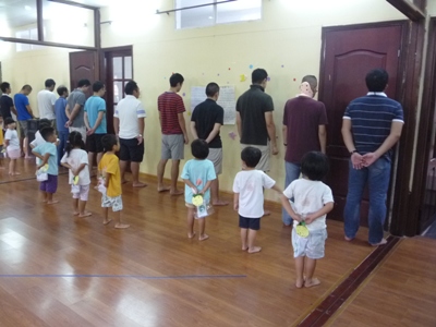 今日はお父さん全員で、4つのポーズ(足を開いて立つ、前屈、お山座り、ゴロ寝)で、