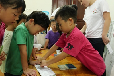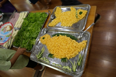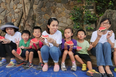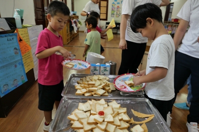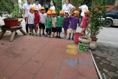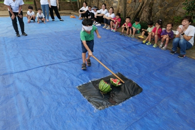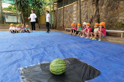 パジャマから朝の服に着替え、顔を洗ったら朝のお散歩へ出発進行~~♪♪ 元気な声で『いってきまーーーす!!』と挨拶をして出かけました 朝の散歩には何があるのかドキドキわくわくしながら歩いていくと、お花 また運動をしている方もいて、元気よく『xin chao!!』と挨拶をしました 最後は大きなきょうりょうの足跡も見つけましたよ これには子どもたちも驚いて視線は釘付け!! 久しぶりの園外のお散歩の時間を楽しく過ごすことができましたよ。 歩いているとどこからか『おなかすいた~~~』と声が聞こえてきました。 が、、、 園に帰ってからはラジオ体操です 朝食はこの後で(^-^) ラジオ体操係のお友だちが前に出てしてくれました。 いつもは先生がしているけれど今日は特別 です。 いつもよりやる気満々に見えます☆ 体操が終わってから、ラジオ体操係のお友だちにあしあとスタンプ さぁお待ちかねの朝食の時間です。 朝食はビュッフェです。 次に控えているスイカ割りのことを考えて、食べれる分だけを慎重に取り ます。 「ジャム、ハム、卵、レタス、チーズ、どれにしようかなぁ」 「おかわりでジャムにしよう」 「スイカたくさん食べたいからこれだけにしとく」 など話も広がります。 給食の先生もさくら組さんの喜ぶ顔が見たくて朝食をこんな風にアレンジしてくれまし た!!!!! 「いただきます」のあいさつは朝食係さんのおしごとです。 朝食を食べて歯磨きをしたら、いよいとスイカ割りです 今日は本番なので本物のスイカです!!割れるのです 今まで練習用のスイカで練習していた 成果はいかに、、、、 スイカ割りがかりさんにお手伝いしてもらい始まります。みんながわるスイカは3つです。 5回ぼうに頭をつけて回ります。 ここで少しフラッとなり真っすぐに歩けず、スイカではなく先生のほうに行ってしまう姿も!! おしいっっっっ すいか割を一回するたびに、あつまるこどもたち 見事1つ目割れました!! 2、3個目は残念ながらさくら組さんのパワーだけでは割れなかったので 給食の先生にもお手伝 いしてもらいました。 みんなで食べるスイカはいつもよりおいしかったね! スイカを食べたら絵日記の時間です。 この2日間で楽しかったことを思い出し、、、、 文字と絵にしました 子どもたちの中にはこれが描きたいという思いがあり、絵も字もさくさく進んでいきましたよ そして、帰りの準備をしていると、そわそわし始めて、「おとうさん、おかあさん、もう来てるかな?」 とそわそわし始めた子どもたち。 家族の姿が見えると飛びっきりの笑顔で駆け出していきました とってもよくがんばりましたね! わくわくさくらぐみで、いつも一緒にいたお父さん、お母さんから離れて、お友だちとすごした2日間。 とても思い出深い日になったのではないかと思います。 1つ大きくなったさくらぐみのみんな。この経験を生かしてまた色んなことに挑戦していって欲しいなと思います。 これから運動会!力を合わせてがんばろうね! 最後になりましたが、月曜日のお休みのご協力をありがとうございました。 ※インスタグラムでも、日々の様子が見られますので、そちらもご覧下さい。 (きいろちゃん) ベトナム・ハノイの日系幼稚園 さくらHoaAnhDao幼稚園ホームページ |