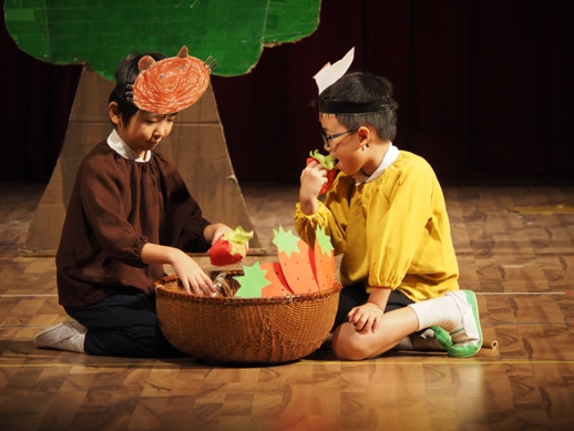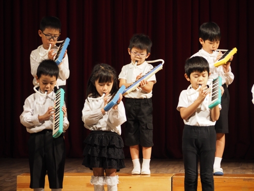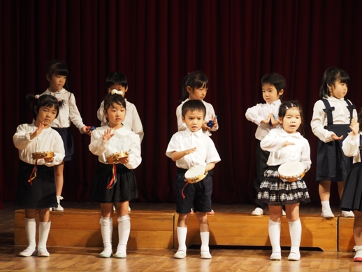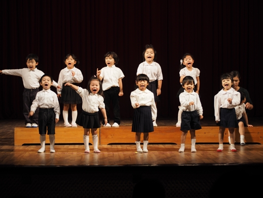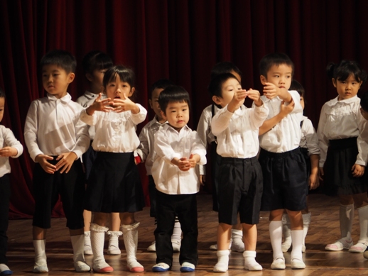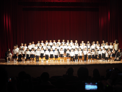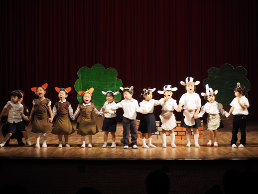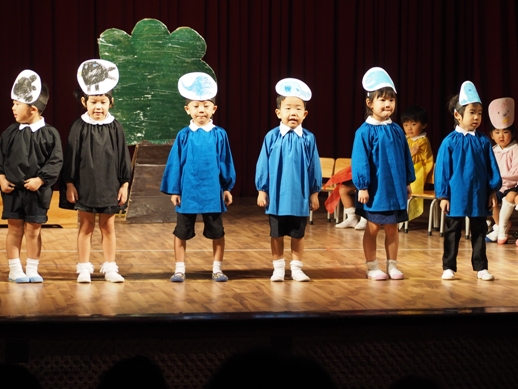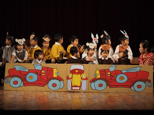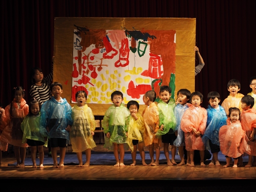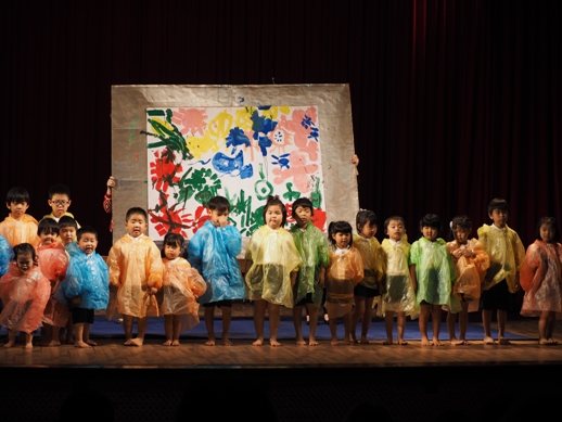 この日のために、各クラスで取り組み、見事な姿を一人ひとり見せてくれました。 一年間の子ども達の成長が、しっかり詰まった素敵な発表になりました。 毎年、発表会のオープニングは、さくら組(年長)の太鼓です。 今年は、太鼓に踊りをミックスさせた、≪ソーラン節≫を見せてくれました。 たくさんのお客さんに、少し緊張した表情ですが、さすがさくら組。 素晴らしいスタートになりました。 プログラム1≪異年齢グループ~絵画遊び~≫ 異年齢グループとは、全園児が2つのグループに分かれて、 (自分の好きなグループを選びます) 小さなお友達と大きなお友達が一緒になって発表します。 絵画遊びグループは、テーマをふたつ決めて、思い思いに描いていきました。 小さなお友達もしっかり筆を持ち、ダイナミックに表現し、 その隣に、お兄ちゃん達が描き加えていったり、またその上から、違うお友達が描いていき、 一つのものが出来上がりました。 洋服が汚れないように、カッパを着て描いた子供達。 カラフルで、かわいいですね。 『お菓子の街』 『花火』 プログラム2≪なのはな組(年少)歌~とけいのうた・おなかのへるうた~≫ 2つの歌を合わせ、フリ付きで歌い、大きな声がホールに響き渡りました。 プログラム3≪すずらん組(年中)劇~くじらのだいすけ~≫ 長いセルフもよく覚えました。 少し恥ずかしい気持ちも出てくる年齢ですが、最後までしっかり発表することが出来ました。 取り組みを積み重ねた姿が現れていました。 プログラム4≪さくら組(年長)鍵盤ハーモニカ~ふるさと~≫ さくら組になって初めての活動の集大成でもあった、鍵盤ハーモニカ。 早くなったり、指使いが難しいところもありましたが、 それでも、一年間取り組んできた頑張りが出ていました。 ハノイで聴くふるさとに、じーん・・・ プログラム5≪いちご・もも組(年年少)劇~のせてのせて~≫ 一番小さなクラスのお友達です。 大きなステージの上に立つだけでも立派な子ども達ですが、お母さん、お父さんに手を振る姿や、元気に発表する姿は、本当に微笑ましかったです。 『ストップー!のせて、のせて』と言う、セリフが、ホールに広がりました。 プログラム6≪異年齢グループ~わらべうた遊び~≫ お兄ちゃん、お姉ちゃんが小さなお友達とペアーになり、助け合ったり、 一緒に歌ったり遊んだりする姿は、微笑ましい様子だったと思います。 遊びをアレンジし、みんなで楽しむことが出来ました。 プログラム7≪なのはな組(年少)劇~おおかみと7匹の子ヤギ~≫ 一人ひとりの声が良く聞こえて、この年齢ならではの素の姿を見せてくれました。 みんなでいっしょに言うセリフの前には、『せーの』と、大きな声で言ったりして、 のびのびと発表していました。 おおかみのお腹に詰まった石で、お腹が膨れているの分かりますか? プログラム8≪すずらん組(年中)合奏~ねこバス~≫ ダンスと合奏を発表しました。 ピアノを聞く、リズムを合わせるなど、自分ひとりではなく、 みんなと気持ちを合わせてしっかりと発表することが出来ました。 プログラム9≪さくら組(年長)劇~ともだちや~≫ 最後を締めくくるにふさわしい発表になりました。 とにかく、笑顔あふれ、一人ひとりが楽しんでいる姿がしっかりと現れていました。 クラスみんなで力を合わせた、素晴らしい劇になりました。 エンディング~きっと~ 全園児がステージに上がり、みんなで歌いました。 一人ひとりの声がしっかりと広がり、みんなで一緒に作り上げた発表会が現れていました。 三学期から始まった取り組みでしたが、この活動を通して、一人ひとりが大きくなり、 自信につながっていきました。 保護者の皆様の、ご理解ご協力に感謝です。 これからも、子ども達のぐんぐん大きくなっていく姿をたのしみにしています!! ベトナム・ハノイの日系幼稚園 さくらHoaAnhDao幼稚園ホームページ |