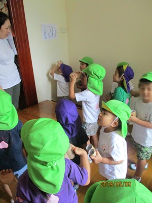 過ごしやすい気温の中、なのはな組といちごもも組で動物園に遠足に行って来ました。 遠足前日には、、、 あれれー?昨日までいちごもも組に貼ってあった動物たちが少なくなってる! ということで、幼稚園の中を探検! トイレットペーパーの芯で作った双眼鏡を持って、 ランチルームや園庭にもテクテク歩いていきました。 動物発見!に喜ぶ子ども達でした。 遠足当日! ①お友だちと手をつなぐ ②先生のお話をよく聞く ③柵から手を出さない の約束を確認しながら、動物園へ。 しっかりと約束を守って歩くことができました。 動物さん、とっても近くにいるね 大きいね ぞうさんは草を食べてるね 等々、動物たちをよーく見て感想を口にだして教えてくれました。 ライオン、熊、トラ、サル、キリン、かば、ゾウ、馬、鹿など たくさんの動物に出会うことができました。 たくさん歩いたので、途中でお水休憩もしっかりと 自分で水筒を持ってしっかり飲めていました。 幼稚園に帰ってきた後は、お待ちかねのお弁当! みんなとっても嬉しそうにモリモリ食べていました ご準備ありがとうございました。 たーくさん歩いた疲れもあり、いつも以上にぐっすりお休み… お昼寝の後はなんと!教室の中に隠されている動物メダルを探します★ あるかな~?どこかな~? 全員が動物メダル 動物メダルを持ってハイ、チーズ★ は、いちご&もも組さん。 またみんなで行きたいね、とお話してくれるお友達もいましたよ ニコニコいっぱいの遠足となりました。 (りんご・もぐまる) ベトナム・ハノイの日系幼稚園 さくらHoaAnhDao幼稚園ホームページ |