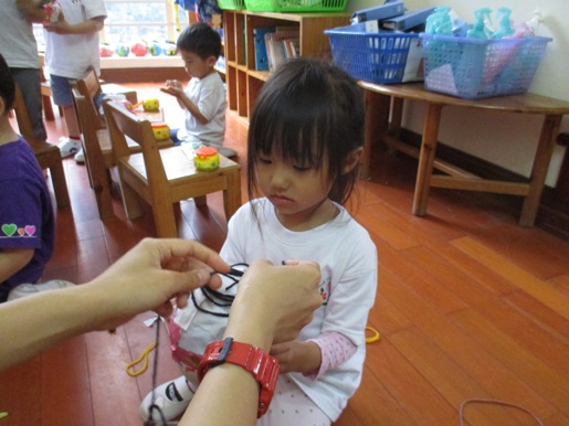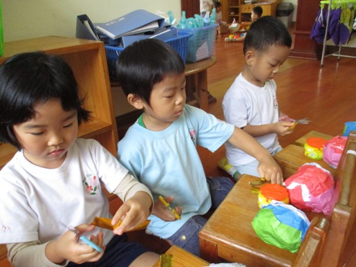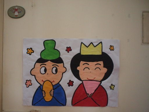 2週間かけて、ゆっくり作りました。 ①新聞を丸めて、形を作ります。 大きいのつくるー!! おにぎりみたい!と言って、ぎゅっぎゅと、丸めて形を作っていきました。 それに、白の紙をちぎって、新聞が見えないように、貼っていきました。 なんで白なの?と、気になる子どもたち。 写真を見たり、お雛様の人形を見たりして、 『お化粧してるんだね』と、話をしました。 すると、クラスのお友達が、 「ママもお化粧するけど、白くないねー」と、教えてくれました。 『そうだね~』と言って、みんなで笑いあいました! ②おりがみをちぎって貼って、着物づくりです。 おだいりさまは、青と緑。 おひなさまは、赤とピンクの着物にしました。 おりがみなので、白いところにのりつけてはるよ! と、伝えながら活動を始め、 大きくちぎって、すぐに完成してしまうお友達もいれば、 小さくちぎって、ゆっくり作り上げていくお友達もいて、 一人ひとりのペースで、作り上げていきました。 キラキラの模様は、 はさみで、一回切りをして、のりで貼りました。 ここですでに、形が完成してましたので、 「ねーねーはやく、お顔描きたい!!」 「髪の毛はどうするの?」 と言って、完成を楽しみにしている子どもたちでした。 ③毛糸をぐるぐると、髪の毛をつけます。 大人が手伝いながら、お雛様をぐるぐる回しながら、毛糸を付けていきました。 「目が回る~!!」 「もうちょっといっぱい髪の毛つける!」 と言って、ぐるぐる回しながら個性あふれる作品になってきました。 さいごに、マジックで目と口、ほっぺたをつけたいお友達は、ピンクで丸を描いて、 完成しました。 本物の、おひなさまとおだいりさまと比べながら、 「冠かぶってるは同じだね!」 「あっ!でも、髪の毛は短かったねー」 と言って、くらべっこしていました。 おひなさまの扇子を見て、 「これ知ってるよ。お父さん、お母さんが暑いときに使うんだよー」 みんなに教えてくれました。 最後に、『かわいいおかおではちーず♪』 みんなのおうちに、かわいいおひなさまが飾られました!! (#082) ベトナム・ハノイの日系幼稚園 さくらHoaAnhDao幼稚園ホームページ |
