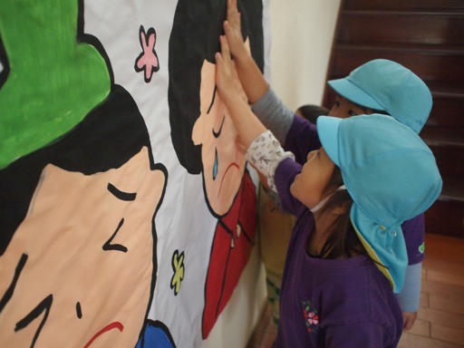 おひなさまパーティーを開きました。 3月になり、部屋の前お雛様を飾っていました。 しかし… 3日の朝、、、 おひなさまとおだいりさまが泣いているのに気が付いた子どもたち。。 すぐに、よしよししてあげる子どもたち。 「どうしたのかな?」 「なんでないてるのかな?」 と、言っていると、 「あぁぁ!!かんむりもないし、ぱたぱたするものもないよー」 と、発見した子どもたち。 すると、お部屋から、一通のお手紙を発見◎ お手紙が読めないので、 お外で遊んでいた、さくら組(年長)、すずらん組(年中)が読んでくれました。 「えー!!かんむりも扇子も、しゃくもなくなったんだってー!!」 「探さないと!!」 「これどこにあったの?」 「近くにヒントがあるかもしれない!」 と、さすがお兄ちゃん、お姉ちゃんたち!頼もしいです。 子どもたちも、 「ここにあったよ」 「かんむりが黄色で、扇子はピンクだったよー」 と、お話しながら、大捜索のはじまりです! いちご、もも組、なのはな組は外に行って探すことに!! あるかなー?どこかなー? と、探しながら歩いて行きました。 大発見^0^ ピンクの扇子を見つけました。 こんなところにあったねー!誰が落としたんだろー と、子ども達の中では、色々な想像を膨らませていました。 扇子と、かんむりは見つかったのですが、、 しゃくが見つからずに、いつも見守ってくれている、 子どもたちが神様と呼んでいる犬に、聞いていました。 「どこにありますかー?」 「向こうにあるっていってるよー」 と、話しながら、幼稚園に戻りました。 すると!!! さくら組さんから、 「いすの裏にあったよー!!」と、教えてくれて、全部見つけることができました◎ みんなで貼り付けて、これで一安心!! さぁー!! おひなさまパーティースタートです! 前日から、おひな祭りは、特別なので、特別な『あまざけ』を飲む話をしていました。 「あまざけってなに?」 あまざけと言うのは、白いお酒で、いっぱい飲むと酔っ払っちゃうから… みんな気をつけようね。。とお話しました。 魔法のコップに魔法をかけよう!と、目を瞑って魔法をかけました。 目を瞑りながら、どんなことを考えてるのかな。。。 甘酒をもらって、「これあまざけ?」 と、お友達と言いながら、少しずつ飲んでいきました。 たくさん飲んだらいけないよーと、 なのはな組が、小さなクラスのお友達に伝えてるところも、 本当にかわいいですよね^^ 実は、 あまざけ…と言っても、お水です。。 いつも飲むお水を、 紙コップに入れてみんなに渡しました。 魔法がかかってしまったお友達は、 「なにかにおいがするよ」 「顔が赤くなった?」 「よっぱっらた?』と友達同士で話してる姿も見られました。 たのしかったねーと、話をしてると、 あぁー!!何かお手紙がきてるよ!と、大発見◎ なんと、 お礼のお手紙が届いていました! 読んでみると、なんと、みんなにかんむりのプレゼントが!!! 喜んでみんなでかぶってみました! 女の子達、とってもお似合いですね! おだいりさまとおひなさまのようで、かわいいですね!! 《お楽しみランチ》は、全園児でホールで食べました。 みんなで食べるおたのしみランチは、わいわいとたのしく食べることができて、 みんな大好きです^^ 大きな口をあけて~あーん!!!もりもりたべました! たのしかったおひなさまパーティー☆ プレゼントももらって、たのしい一日になりました。 男のこの日は、5月だねー!!と言って、 男の子は、5月を楽しみにしていました!! (#082) ベトナム・ハノイの日系幼稚園 さくらHoaAnhDao幼稚園ホームページ |