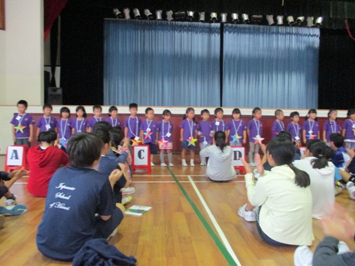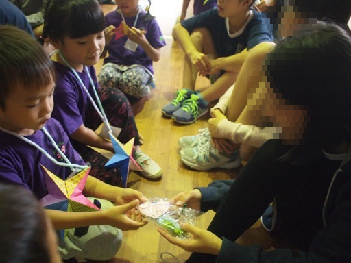 その時の記事 そして、今回は中学校へ招待していただき、 さくら組(年長組)が、わくわくいっぱいで遊びに行かせてもらいました。 はじめは、 緊張してちいさな声で挨拶になってしまったり、 ドキドキの表情だったのですが、 「だいじょうぶ?」「バスで来たの?」など、声をかけてくださって、 こどもたちも、少しずつ慣れていきました。 まずは、みんなでレッツダーーンス!! ボックスステップや、早い動きもあったのですが、 優しいお兄さん、お姉さんがいっしょに踊ってくれたりして、 すぐに覚えることができました。 「もう一回やりたかったー」と、お兄さんにお願いしている、さくら組のお友達もいました。 そして、たのしいゲームを3つ。 <新聞ゲーム>では、じゃんけんに負けたら、新聞が小さく折りたたんでいきます。 小さくなった新聞から落ちないように、抱っこしてもらい、 じゃんけんに負けてしまっても、うれしそうでした! <フープくぐりゲーム> グループで手をつないで、フープをくぐっていくゲームです。 これは、ちいさなさくら組の方が上手で、すいすいくぐっていったので、 お兄さん達は、「やっぱり上手だなー」と言われてにこにこの表情が見られました。 大きなお兄さん、お姉さんに「がんばれー」と応援していました。 <じゃんけん列車> 2人組で、列車になりじゃんけんをして、長い列車を作っていきました。 この日は、 ハノイにある他の日系幼稚園のお友達も遊びに来ていたので、 いろんなお友達ともじゃんけんをしたりして、 交流を持つことができました。 そしてなんと! じゃんけん列車の一等賞はさくら組のお友達でした! さくら組みんなで、よろこびました!! 最後に、お兄さん、お姉さんたちが、絵本をよんでくれました。 毎年、中学3年生は自作の「手作り絵本」を読んでくださるので、 子どもたちも、絵本の世界にどっぷりと入り込んでいました。 楽しい時間はあっという間で、お別れの時間になりました。 お兄さん、お姉さんたちから、 手作りの星のペンダントをもらって、お別れの挨拶。 そして、 子どもたちも、手作りのアイロンビーズと指編みのキーフォルダーを、 ひとり一人が、プレゼントしました。 「これつくったの?すごいねー!」と言って、もらえて、子どもたちも喜んでいました。 いろいろな、たのしい活動を考えてくれて、 いっしょに遊ぶことができて、とても楽しい時間を過ごすことができました。 また会えるかなーと言って、どこかでまた、会えるのを楽しみにしている子どもたちでした。 (#082) ベトナム・ハノイの日系幼稚園 さくらHoaAnhDao幼稚園ホーページ |