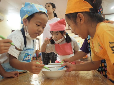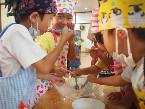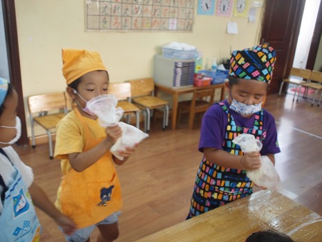 今月のさくら組(年長組)クッキング、アイスクリームを作りました!! 前日から、 「明日は、実験クッキングです!」と、伝えると… 『えー!!!なにそれー!!』と、興味津々で、朝から… 『今日は、実験クッキングなんでしょー!なにつくるの?』と、わくわく!! それでは、レッツクッキング!! 「今日は、牛乳、生クリーム、練乳、はちみつ、バニラエッセンス、塩、氷で…アイスクリームをつくりまーす!!」 『えー!!!つくれるの!』と言って、目を輝かせていました。 材料をゆっくり入れて、こぼれないように真剣です。 『これでほんとにつくれるの?』という、不安の声もありました。。。 全部入れて、しっかり閉める時に、 『こぼれたら、アイスクリーム少ししか食べられないよー』と、 くいしんぼう発言の子ども達。 別のビニール袋に、氷と塩を入れて、その中に、材料の入ったビニール袋を入れて、 しっかり振りました。 これが、 本当に冷たくて…部屋中で、 『つめたーい!!』『てがいたーい!』と言っていましたが、 『アイスクリームのためだよ!!』と、またまた・・・ くいしんぼうなことを言いながら、一生懸命に振っていました。 出来たかなーと言って、袋から取り出して確認すると、 8個中2個大成功!! しっかり、アイスクリームのように固まったものが2個出来ました。 アイスクリームを見て、 『すっごーー!!』『アイスクリームだ!!』と言って、 大感動していました☆ 『できたかな?!』と言って、途中で取り出してみたり、 手の熱で溶けてしまったものもあったのですが、 液体からシェイクのような、ドロッとしたものが出来ました。 出来たものを食べてみると、、、 甘くて美味しく出来て、子ども達も、 『おいしー!!』『がんっばってよかったねー!』と、 にこにこ笑顔でした。 シェイクになってしまっても、 『これもおいしいよー!』と言って、みんなで食べました。 この日は、初めての実験クッキングで、 はじめは、できるかなーと心配していましたが、 なんとか…おいしく、たのしくできて本当によかったです。 氷を多めに使うのですが、ぜひ!! おうちでも、フリフリシェイク♪して、おいしいアイスクリームを作ってみてください!! つぎもこれつくりたーい! と、リクエストがあったのですが 来月はまた新しい物に挑戦。 11月のクッキングも、小さなコックさんになって、たのしく作りたいと思います◎ (#082) ベトナム・ハノイの日系幼稚園 さくらHoaAnhDao幼稚園ホームページ