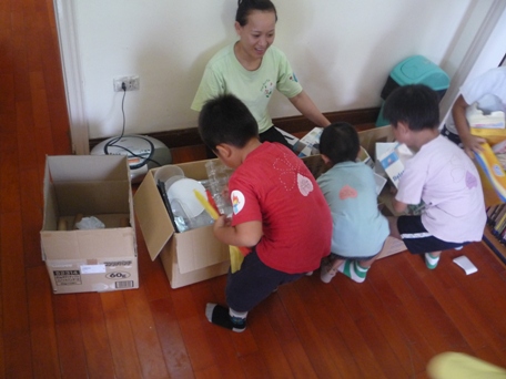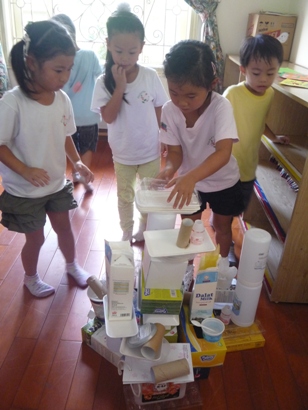 さくら組(年長)は、<大会>と言う言葉が大好きで… 前日に、「明日は、ゲーム大会です!!」と、伝えると、 『イエーーーイ!!』と言って、すごく盛り上がります! 当日の朝、子ども達にも分かるように部屋にゲーム内容の紙を貼っておくと、 『これって今日の大会?』『わくわくするー!』と言って、 やる気いっぱい、わくわくいっぱいでした。 さあ!4つのグループに分かれて大会スタートです! ①オセロゲーム 白と黒の紙を、どちらが多く自分のグループの色(白or黒)にひっくり返すことが出来るか。 という、ゲームです。 説明を聞きながら、燃えている子どもたち。 必死になって、ひっくり返していました。 周りの応援も、熱がこもっていましたよ! ②CDゲーム CDをスライドさせて、自分の陣地から相手陣地により多くCDを入れた方が勝ちです。 とにかく力いっぱいにスライドさせていくお友達や、 遠くに投げられたCDを取りに行くお友達・・・などなど。 いろいろな作戦が考えられていて、 見ているお友達も、『こっちまで飛んできたー!』と言って、 笑いがあふれていました! ③積み重ねゲーム 今、作品展のためにいろいろな廃材を集めています。 その、廃材をより多くの数を使って、積み上げていくゲームです。 高くしなくても、積み重なっていればOKです! グループで使えそうな廃材を探しています。 そして、一生懸命に考えて積み重ねていきました。 この力作は、芸術品ですよね!協力して積み重ねています。 ④イスゲーム 両手を挙げて、足を付けずに我慢して、どちらが長く座っていられるか! というゲームです。 どのゲームよりも…一番長く時間がかかったゲームでした。 子どもたち、ずっと座っていられるほど余裕な表情のため、、、 足をグーにしたり、パーにしたりと動きを入れてみました。 すると『も~だめー!!』と言って、ギブアップ! この、負けない気持ちは素晴らしかったです。 毎日、たのしい経験をしながら、友達と関わり、 時にはぶつかり、励ましあい、笑いあい、 友達の存在を1人一人がもっていくのだと思います。 今だから感じる気持ちも大切にしながら、 これからも、すごしていきたいです。 (#082) ベトナム・ハノイの日系幼稚園 さくらHoaAnhDao幼稚園ホームページ |