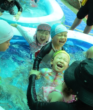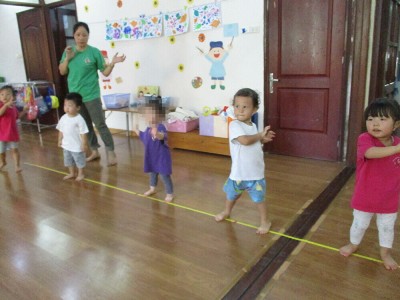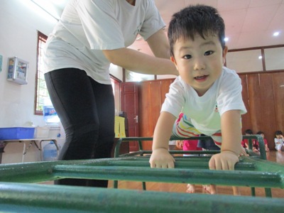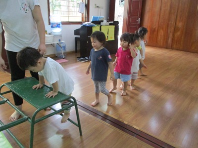 ちょっと外遊びが難しくなってきている時期のハノイですが、 いちご組、もも組は、ホールを使ったりして、体をしっかり動かして、 毎日★エンジョイしています◎ 運動あそび しっかり、手の力、足の力を使って、よいしょー!と、登っています。 後ろに並んでいる姿も、とってもかわいいですね!! 両手でぎゅっと握り、はしご渡りも、上手になっています。 「まえみてー!まえみてー」と、声をかけていますが、 子ども達自身も、出来るようになったことが嬉しい表情を見せてくれています◎ 週2回プールに入っています。 ワニさんになって、トンネルくぐり!! お顔に水がかかっても平気になってきて、 大きなフープや小さなフープを上手にくぐっています。 体の浮力も、上手に使っていますね! プールの中でのふれあい遊びも大好きで、 保育者の背中に乗ってみたり、みんなでバスごっこをしてたのしんでいます。 毎回、わぁぁー!!きゃぁぁー!と、子ども達の声が園庭に広がっていますよ♪ とびきりスマイルが輝いていますね★ もうすぐ七夕会があります。 毎年、7月のお楽しみ会の七夕会では、各クラスで発表をしていきます。 いちご、もも組は、『うた…きょうりゅうガオー』『ダンス…きょうりゅうごっこ』を、 発表します。毎日、元気にうたを歌い、 体を動かして、見てもらえるのをたのしみにしています! ホールで印に立ち、並んでいる姿。やる気十分ですね!! しっかり遊んだ後は、美味しい給食をもりもり食べています◎ 大きな口をあけてぱぁーく!! 全員が完食でき、なかにはおかわりをするお友達もいます^^ 「今日の給食にはなにがはいってるかなー」と言って、 食材にも、興味を持ち始めています。 しっかり食べた後は、体をゆっくりと休めていきます。 この午睡は、体が大きくなっていく準備時間として、とっても大事な時間です。 そして、天使の寝顔を見せてくれる、、、癒しの時間でもありますね。 体、頭を使い思いっきりあそび成長し、 お腹が空くからご飯を食べる、 疲れて眠る。そして、再び成長への活動をスタートさせる。 子どもたちにとって、それがとても大事なことです。 日々の生活、『あそびから生まれる発達』『あそびを通して育つ姿』を、 これからも大切に、保護者の方達と一緒に、見守っていきたいと思います。 (#082) ベトナム・ハノイの日系幼稚園 さくらHoaAnhDao幼稚園ホームページ |