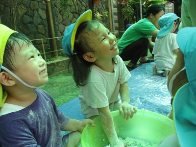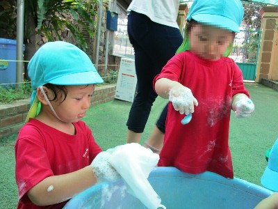 涼しい時は朝からしっかりと外遊びを、 小さなクラスのいちご、もも組も楽しんでいます。 『みんな大好き!小麦粉あそび』 水を入れて、小麦粉粘土はよく遊ぶのですが、 水を入れないで、まずは粉だけでダイナミックに遊びました。 手についた粉をふーと飛ばして、 顔が真っ白になって遊んでみたり、 粉がついた手をパンパンと叩いて、 粉が舞うのをたのしんでみたりしました。 『あわ!泡!あそび』 せっけんを泡ネットであわ立てて、たのしみました! 初めての活動で、泡に触るのに抵抗があったお友だちもいましたが、 「ごしごーし!♪」といって、コップを洗ってみたり、 コップに泡を入れて、スプーンでぐるぐる混ぜたりしてたのしんでいました◎ 手についた泡を見て、、、 「おてて洗う泡と同じだねー!」と、大発見した様子で 話をしてくれたお友だちもいました! ついつい、、 「あわで遊ばないよー」「手を洗うよー」と、普段は声をかけていますが、 今回は思いっきり!!泡を手につけたり、 ふーとしたりしてたのしみました! もちろん!! 大きな園庭で、砂遊び!水遊び!泥遊びもやっています!! 水を入れてはだして、、を繰り返しビシャビシャになったり、 足元にできた水溜りの上をジャンプ!! もぉー★すきなことだらけですよね!!! 「おててがなくなっちゃったー!」と、 お兄ちゃんたちの姿を真似して、作る姿も本当にかわいいです。 どの活動も、子ども達は興味深々で、笑顔が耐えることがありません。 「きゃー!!」と言って、 園庭に笑い声が広がっていました◎ 保護者の方々、いつもお洗濯ありがとうございます。 (#082) ベトナム・ハノイの日系幼稚園 さくらHoaAnhDao幼稚園ホームページ |