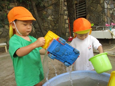 子ども達に、「このすべり台ってね、お水が出てくるすべり台なんだよ!!」と伝えると、 「えーーーー?!すごい!!」と目を輝かせておはなしを聞いていました。 朝すべり台を組み立て、ホースをつけてみると、すべるところから水が出てきました。 今までとは一味違うすべり台に興味津々の子ども達。 列をつくって順番を待ち、一度すべると、 「もう一回」「このすべりだいおもしろい!!」と言って何度もすべる姿がみられましたよ。 いろんな発想や探求心のを持っている子ども達、 お水が出るところにスコップを持ってきてお水をためたり、 水が出てくるところに足や手を置いてどうなるか試す姿もみられました^^ 大きいクラスだけでなく、小さいクラスのお友だちもやってきて一緒にすべり台を楽しみましたよ^^ 下に大きなお池を作って おもいきりダイブ! お山から流れる三角州を作るおともだちも。 さあ、ながすよ~!! すごーい!流れたよ!! 気持ち良いね♪ お山からお池にジャンプするお友だちも! 何回も繰り返していました。 もう楽しくって仕方ない!! 全身を使って泥の感触を楽しみました。 まだまだ暑さが続くハノイ。プールだけではなくてお水や泥んこあそびも引き続き楽しんでいきたいと思います☆ ~貴重な滑り台、ありがとうございました~ |