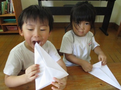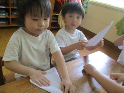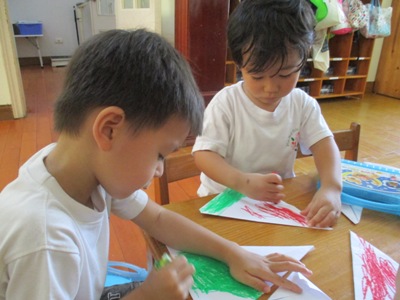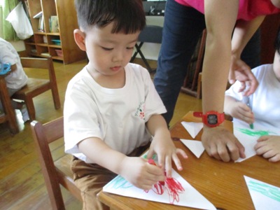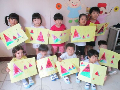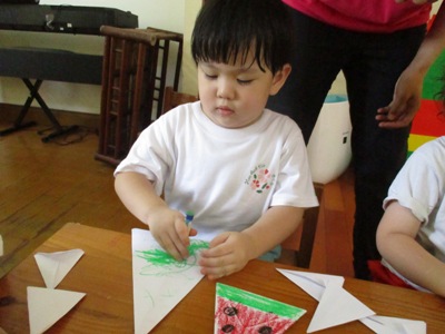 すぐに覚えた『すいかの名産地』の歌は、大好きで 「おうちでも歌っています!」と、保護者の方からも教えてもらいました◎ そんな大好きな歌のスイカを、折り紙で作り、クレヨンで絵を描きました。 大きな紙でスイカをはんぶんことして、折っていきました。 少し難しかったところもあったのですが、 出来上がると「おにぎりみたい!」と言って、 ぱくっと食べる姿もあって、とてもかわいい発想ですね◎ 出来上がったスイカにクレヨンで色を着けていきます。 見本を見ながら、「ここは緑だね」「ここは食べるところだよね」と、 さすが!!ハノイでは、年中あるスイカですので、親しみがあるようです!! 「いっぱいあかにするー!!」といって、大きくダイナミックに塗るお友達や、 ゆっくりと、はしからはしまで塗っていく姿もあり、 いろんな子ども達の姿があり、 一人ひとりの良さが現れています◎ 出来上がりを画用紙に糊で貼り、周りをクレヨンで描いていきました。 「とーもだちーがでーきーたー♪」と、歌いながら、 周りにお友達を描いたり、リンゴを描いたり、 『おばけなんてないさ』の歌も歌っていますので、、おばけも登場していた お友だちもいました!! 個性溢れる、夏らしい素敵な作品になりした。 手先を使い、これからも色々な活動をしていきたいと思います! さぁーつぎは、、、なにつくろうかな** (#082) ベトナム・ハノイの日系幼稚園 さくらHoaAnhDao幼稚園ホームページ |