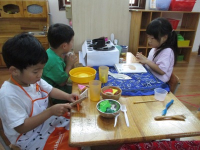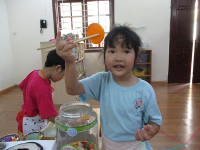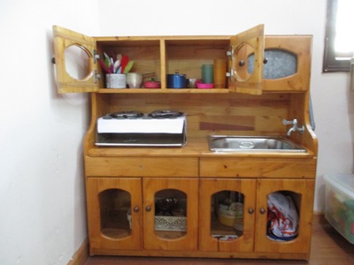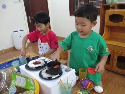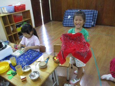 「ねぇいまからおままごとしよう」とよく言っています。 最近、布やエプロン、はし、ガスコンロなどを新しく用意するとそれだけで子ども達の遊びの世界が広がっていきます。 普段の生活のなかでお母さんにしてもらっていることを、お店屋さんに行ったこと、病院にいったことなどを再現して遊んでいます。 こちらは、カゴに布を敷いて,ぬれた物を入れるかご。 そして、おままごと中に絵本読んでるの?ときくと、 「いまほんをみておりょうりしてるの^^」と教えてくれました。 発想が豊かで毎回違う設定で楽しんでいますよ。 体温計を持ってきて、 「すごいお熱があります!!でも大丈夫!!このお野菜たべたらなおりますよ^^」 なんて会話もきこえてきます。 お互いになりきっているので会話も弾み、お母さん、お父さん、お姉ちゃん、店員さんとさまざまな人に変身していますよ。 片付けももちろん自分たちでしています。 片付ける場所も話しをして、これはここが良いよ。といってきれいにかたづけていますよ。 すずらん組さんの大好きなあそびの紹介でした。 (きいろちゃん) ベトナム・ハノイの日系幼稚園 さくらHoaAnhDao幼稚園ホームページ |