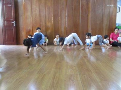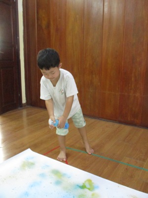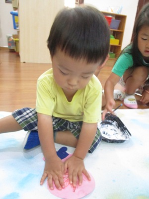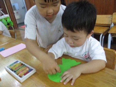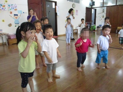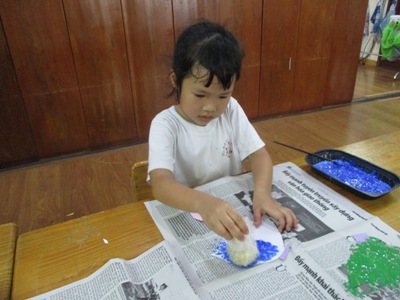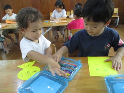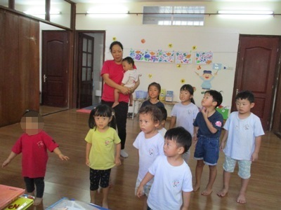 朝の会から一緒に活動スタート! 小さなお友達も、お兄ちゃん達が歌ってくれるので、 いつもよりも大きな声がホールに響いていました。 いちご、もも組が大好きな、アンパンマン体操からはじまり、 合同リトミックも、ホール全体を使って、思いっきり体を動かして取り組みました。 まずは小さなお友だちから、ゆっくりと、小さな体を動かして、 お姉ちゃん達に「かわいいー」「がんばってー」と、エールをもらい、 うれしそうにすることが出来ました。 そして、すすらん組は、 見てもらえて嬉しい、がんばるぞの気持ちで、 いつもよりはりきって取り組む姿が見られました。 すずらん組の走るスピード感をみて、小さなお友達も「みてみて!」と、 指をさして見入っていました◎ 《あめあめルンルン》製作をしました。 小さなお友だちは、クレヨン画で、カッパの子どもの顔を描き、 すずらん組は、描かれた線のうえを切って、カッパの子どもと、傘を作りました。 傘は、ぷちぷちのタンポで模様をつけて、 色々な傘が出来上がり、楽しい気持ちになることができますね! 模造紙の雨は、 シュッシュとスプレーで、青と黄色のグラデーションがとっても綺麗に表現されています。 子ども達も、喜んで活動をすることが出来ました◎ クラスだけでなく、いろんなお友だちと関わりを増やして、 『遊びから得ることの出来る』ものを大切に、 これからも、日々子ども達の笑顔を大切に、保育をしていきたいと思います。 (きいろちゃん、#082) ベトナム・ハノイの日系幼稚園 さくらHoaAnhDao幼稚園ホームページ |