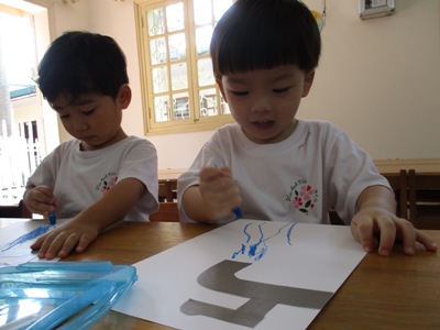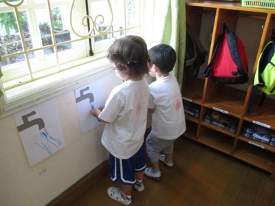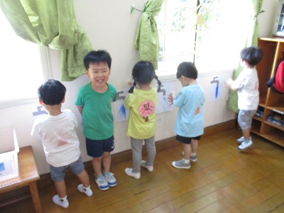 お母さんとの朝のお別れの時間には涙でてしまう子もいました。 だけど涙は朝のお別れの時だけで、その後は元気にお友だちと一緒に遊んでいます。 朝の支度が終わると、新しいクラスのおもちゃに夢中になって遊んでいるなのはな組の 子どもたちです。 コロナ対策で幼稚園では、今まで以上にこまめに手洗いをしています。 手洗いをする機会が増えたということは、水道を使う機会が増えます。 そこで、イメージをすることやお母さんごっこなどのなりきり遊びも楽しい子ども達と一緒に、 今回は水道からでる水をイメージして縦の線を描きました。 描く前に、実際に水道を見に行き、たくさんお水を出してみたり、 少なく出してみたりお水の量が変わる変化を見て楽しみました。 その後にクレヨンを使い実際に描いていきました。 縦の線を描くのが楽しくて、ついついたくさんお水を出しすぎてしまった子も中にはいますが、 「これはちょっとのみず」と言って沢山の水の隣に描きたしていましたよ。 描いた絵を部屋に飾ると自分が描いた水道の前で手洗いが始まりました(^^) 可愛らし姿に思わず笑みがこぼれます♡