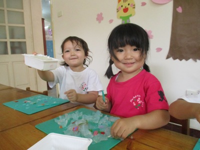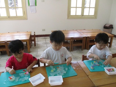 1日目 始める前に、危険のないようしっかりと子ども達に話しておやくそく。 煮たってくると湯気がたち風で湯気が右から左へ流れていたり、 すると、、、ごはんの匂いがする〜〜と嬉しそうにしている子もいましたよ。 2日目 昨日お鍋で煮た寒天、水のようだったのに固まっていて、驚く子どもたちでした。 型から出して思い思い楽しみました。 お弁当を作ったり、おかあさんを真似して包丁できってみたり、、、 最後はぎゅーーーーっと寒天をにぎってみたり。 今度はまた違う素材で感触遊びをしようね。 (きいろちゃん) |