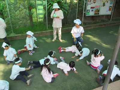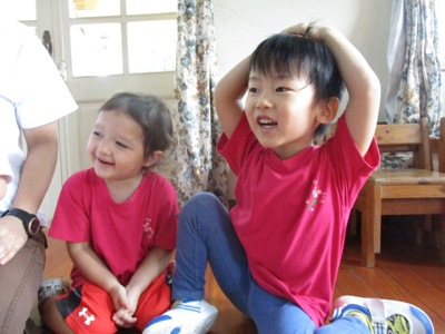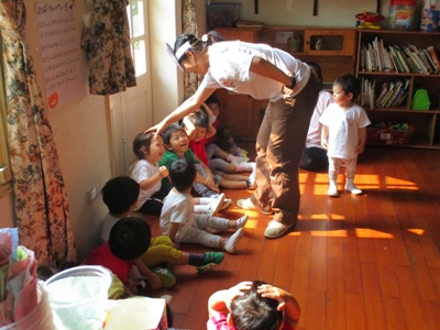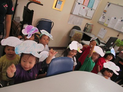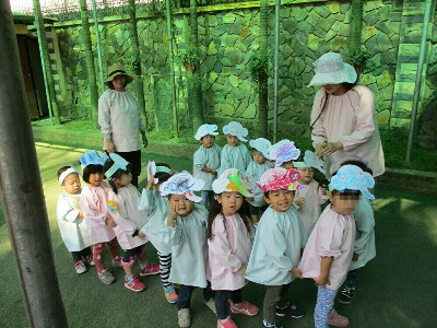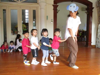 そのお友だちとはこちらのぞうさん!!! ぞうさんの登場に‘‘うわぁぁぁ!!!‘‘ついにきた!!っと大歓声のこどもたち。 ぞうさんに ‘‘こんにちは‘‘ のあいさつをするとぞうさんからも、 ぞうさん流のあいさつをしてもらいこれまた大興奮!! するとぞうさんから「いっしょにあそぼう!!」っとお誘いがあり 足を交互に踏み鳴らし 鼻をゆらしながら歌い始めたぞうさん♪♪ いっぴきのぞうさんくものすに、かかってあそんでおりました~ あんまりゆかいになったので、、、〇〇ちゃん(くん)おいでとよびました~ 2ひきの(繋がっている人数によって数が増える)ぞうさんくものすに、 かかってあそんでおりましたあんまりゆかいになったので、、、 〇〇ちゃん(くん)おいでとよびました~~ 7ひきのぞうさんくものすに、かかってあそんでおりました~ あんまりおもたくなったので~ くものす、、、ぷちーーーーーーんときれました ぞうさんに名前をよんでもらえるのが待ち遠しくてたまらない表情を浮かべるこどもたち ぞうさんに呼ばれて、ともだちと繋がってぞうさんと遊ぶのもたのしい^^ さいごのぷちんっと糸が切れて転がるのもたのしい♪♪ すると、、、ボクも(ワタシも)ぞうさんやりたい!!っとこどもたち それならばっということで自分のぞうさんなりきりお面をつくることに!! クレヨンをつかって好きな色のぞうさんかんせーい!! このぞうさんのお面をかぶると、あちらこちらから ‘‘ぱおーーーん!!”” ‘‘ぞうだぞーー”” っときこえてきます^^ 別の日、、、 ぞうさんのお面をつけて、お友だちのぞうさんも一緒にみんなで一匹のぞうさんをしました。 まずはお友だちのぞうさんが先頭で始まります。 うたも覚えていて、みんなでうたっています^^ すると突然ぞうさんが座り込み、疲れちゃったからもう遊べない、、、っと。 ‘‘どうする??”’ っと子ども達に尋ねると、ワタシが(ボクが)ぞうさんやる!!っとこどもたち。 それならばやってみよう!! 子ぞうたちだけでの一匹のぞうさんのはじまりです!! 〇〇ちゃーーーん(くーーーん) 〇〇ちゃーーーん(くーーーん) 友だちのお顔を見て呼んであげる子ぞうのみんな。 ‘‘重たくないの??”” ‘‘だいじょうぶー”” 全員を子ども達だけで、、いえいえ子ぞうたちだけで呼んで、 くもの糸が切れるところまでできました!! お友だちに興味津々のいちごもも組みの最近の活動の姿でした。 (きいろちゃん) |