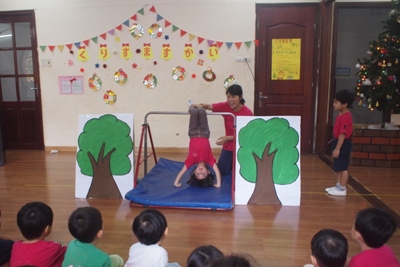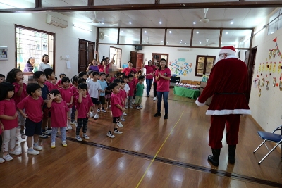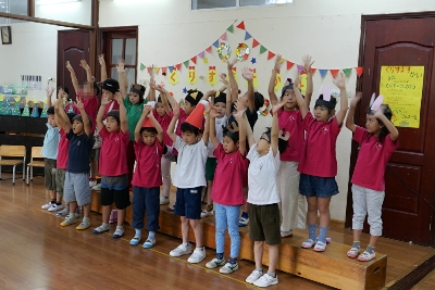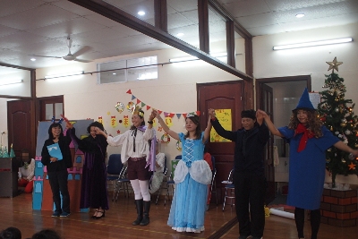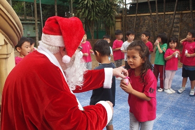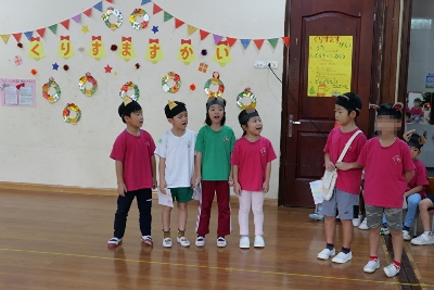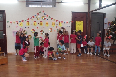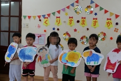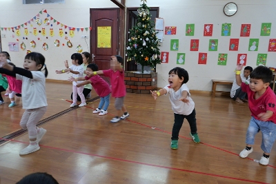 みんながとーーっても楽しみにしていたクリスマス会の日です。 ホールはみんなが作ったクリスマス製作で飾り付けされ、楽しい雰囲気いっぱいです(*^^*) さぁみんなでジングルベルを歌って、クリスマス会のはじまりはじまり~♪♪ まずはすずらん組さんによる、ももたろうのペープサートです。 今日、この日のためにサンタさんが歌に登場するという、特別な歌を作ったそうです!! カラフルに色が塗ってあるペープサートはとってもかわいいですね☆ 続いていちごももぐみです。 クリスマスの曲とクリスマスシャンシャンが大好きになり、 みんなで楽しんで踊ることが出来ました。いつもと違う雰囲気にドキドキ(><)だけど曲がかかるとご覧のとおり!! ふふふ(^^)実はなのはな組さんもこのダンスを覚えていて一緒に踊ってくれています。 次はなのはな組さんの‘ちいさなさんたのものがたり’です。 ~おおきくなったらさんたさん~~♪♪ 大きくなったらサンタさんになれる!!っという思いを胸にサンタさん修行を がんばったちいさなサンタさんたちです。 さいごは、さくら組の森のクリスマスです。 さくらさんも少し緊張していますが、そこはさすが年長さんです。最後まで堂々と演じてくれました。 自分たちで作ったお手紙にプレゼント。 最後はプレゼントをもらえてとっても嬉しそうですよね。 続きましては、どんぐり音楽隊のお姉さんが来てくださり、楽器の生演奏♪ そしてサプライズでわたし達職員と、どんぐり音楽隊のみなさまでシンデレラの劇をしました。 子ども達は先生達の演技に釘付けです☆ 出し物も終わり、そろそろサンタさんが来るのでは??っとそわそわしている子どもたち。 すると、、、、 シャンシャンシャンシャン~~♪♪♪ あーーーーーーーーサンタさん!!!!! \\\HELLO/// っとあいさつをしながら待ちに待ったサンタさんが来てくれました。 大興奮の中、サンタさんへ考えた質問をしましたよ。 ☆なんの動物がすきですか?-----トナカイ ☆何色が好きですか?--------赤 ☆何の食べ物が好きですか?-----クリスマスケーキ ☆一番大切なものはなんですか?---子どもたち 日本語がわからないサンタさんに、さくら組さんの中に英語を話せる子がいて、 力を借りて無事に英語で質問をすることができました。 そろそろプレゼントの時間かな~~っと期待して待っていると、 な、なんとプレゼントをトナカイさんのソリに忘れてきてしまったらしい。 急いで取りに戻るサンタさん。 トナカイさんが恥ずかしがり屋なため、子ども達はホールで待つことに。 プレゼントがありますように、、、、っと目をつむり願いをこめて‘森のクリスマス’を うたって待つことに。 無事にプレゼントをもらうことができてこの表情。 プレゼントをもらっている時に空を見上げ、『いま、トナカイのそりがみえた!!』 っと子どもたち(*^^*) 全部飲んだら願い事が叶う\\\\\魔法のジュース////// をもらい大喜びの子どもたちでした。 サンタさん、\\\\\\ありがとう/////// \\\\\\\THANK YOU VERY MUCH///////// っとお礼を伝えました。 魔法のジュースと、りんりんきこえてくるよすずのねらんちをみんなで食べましたよ。 今日のランチは特別おいしいね~~~♪♪ 実はまだ続きがあり、 他クラスがお昼寝中にサンタさんからのお手紙を見つけたさくら組さん。 午睡後に、\\\\さんたさんからおてがみがきたよーーーー///// っと大興奮で教えてくれました。 クリスマス会の余韻がまだまだ続いています(*^^*) 次はみなさんのお家へ来てくれるかも?! (きいろちゃん) ベトナム・ハノイの日系幼稚園 さくらHoaAnhDao幼稚園ホームページ |