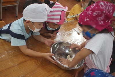 十五夜ということで今回はお月見団子を作りました♪ 前からお月見団子を作ると伝えていたので、 粘土をした時にはみんながお団子を作って練習していた研究熱心なすずらんぐみさん(^^) この日は本当に食べられるお団子作りということで 朝からそのことで頭がいっぱいの子ども達。。 「先生、お団子いつつくるの?」と朝から質問攻めです お昼寝が終わってから作る予定だったので、お昼寝の前に 「作ること忘れてないよね?」と何度も確認、、 お昼寝明けは「クッキングだよ!」というと、 いつも以上にテキパキとお布団を片付けて あっという間にエプロンを着ている子ども達!相当楽しみにしていたようです♪ 始めに豆腐と白玉粉と砂糖を手でコネコネ。。 耳たぶくらいのやわらかさになるまでひたすら真剣な表情でコネコネ。。 「いいんじゃない?」「いい感じ!!」 などと声を掛け合っています♪ 次はお得意のまるめる作業! もう手馴れたものです。 大人顔負けの綺麗なまんまるお団子をたくさん作ってくれました! それではお湯に団子を投入~! 熱いからお湯がはねないようにそ~っと。。 「おいしくなーれ、おいしくなーれ」のおまじないをかけて お団子が浮いてくるのを待ちます。 「お団子ちゃんがんばれー!」 「あともうちょっとで全員浮いてくる!がんばれ!」 と応援していました(笑) 茹で上がったお団子にきなこをつけて完成! 出来立てのお餅を食べて「おいしい!おいしすぎるね!」 と目をまんまるにして喜んでいました♪ 全員おかわりをして大満足なクッキングでした! とても簡単にできるし楽しいので是非おうちでもしてみてください! レシピ↓ さくらHoaAnhDao幼稚園(potato) ベトナム・ハノイの日系幼稚園 さくらHoaAnhDao幼稚園ホームページ |