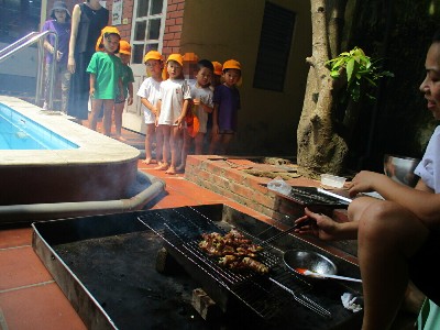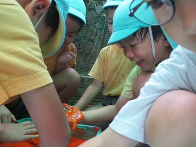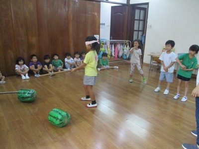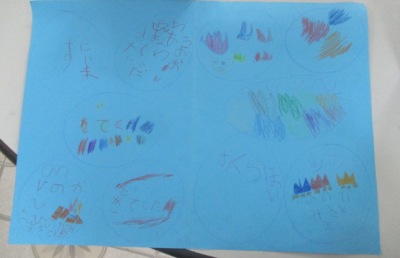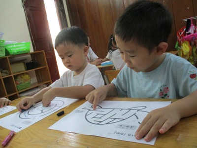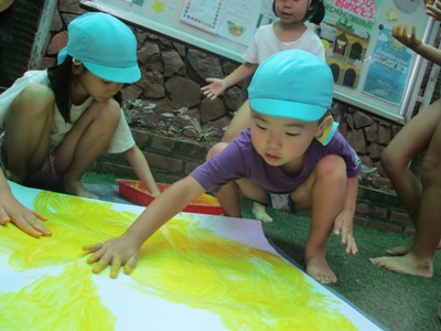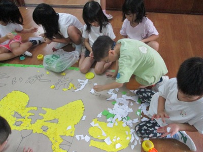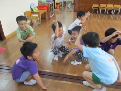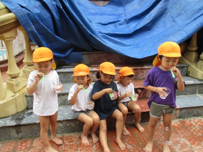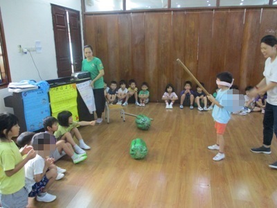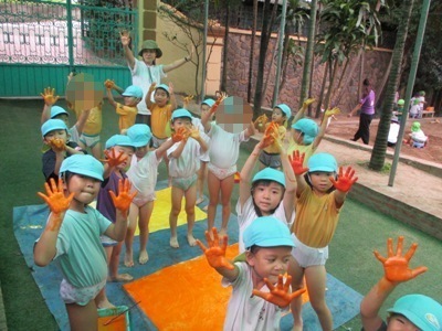 もういくつ寝ると・・・ わくわくさくらぐみ!(幼稚園でお泊り会) ホールに貼ってあるカレンダーを見て 「あと〇日でわくわくさくらぐみだね!」 「わくわくさくらぐみは、25日だね!」 などの声があがるさくらぐみさんです。 そのわくわくさくらぐみに向けての活動をいくつかお知らせします 1つめは「看板つくり」 夕食を食べる会場を【たいがーれすとらん】と名づけ、 そのレストランの看板を毎日地道に作り続けています。 色画用紙を手でちぎって、お友だちと協力しながら隙間なく貼り進めます。 はじめはダンボールの色だった看板がだんだんと色づいてきています 2つめは、 同じく【たいがーれすとらん】で使う「装飾つくり」です。 せんたくのりと絵の具を混ぜたもので トローーーっとの感触も味わいながら、手で色を塗っていきます。 とろっと絵の具をのばしてのばして・・・ とっても真剣! みんなで協力したら大きな模造紙も あっというまにタイガー色でいっぱいになりました。 ここにしましまの模様を付け、 切り抜いて「壁面装飾」をつくります。 3つめは、「模擬スイカ割り!?」です。 スイカわり係のお友達が、目隠しをしてくれ、 ぐるぐるとその場を回ったら・・・ あとは、お友達の 「こっちだよ!」 「もう少し後ろ!」 などの声を頼りに、お友達を信じて突き進み、 「せ-の」の掛け声で、棒を振り下ろします。 当日、スイカが割れて食べられるようしっかり練習していきます 4つめは「キャンプファイヤー」の準備です。 火の神様へ手紙を書き、準備はバッチリ! ギターの音にあわせて ♪もえろよもえろ の歌をうたっています。 ほかにも様々な活動を行っています。 これは、キャンプファイヤー後に行うゲーム「進化 たまご→ひよこ→にわとり とジャンケンの勝ち負けで進化したり戻ったり。 自分と同じ姿のお友達を見つけて、ジャンケンポン!! 笑顔で楽しんでいます さくらぐみみんなの力を合わせて当日までの準備や活動を通して わくわくさくら組への期待を高めていきたいと思います (もぐまる) ベトナム・ハノイの日系幼稚園 さくらHoaAnhDao幼稚園ホームページ |