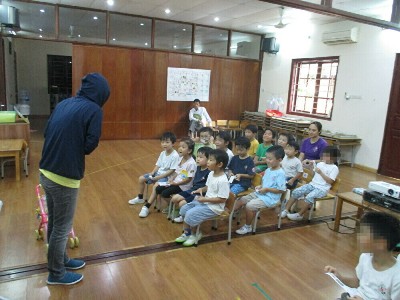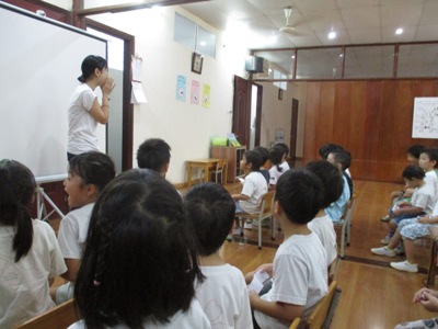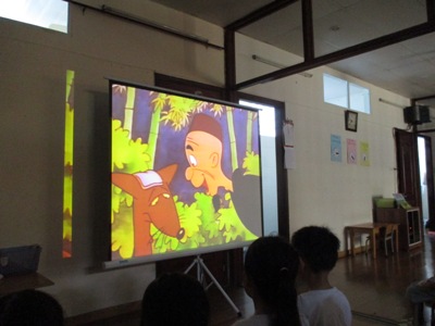 八つ化け頭巾 を、みんなで観ました いつものように、チケットにスタンプを押してもらい、 どんなスタンプかなーと、わくわくいっぱいの子ども達です。 じゃーん 見せてくれた子ども達 さぁーみんなが集まって、そろそろ。。あれ? 映画館館長 みんなで呼んでみよー \えいがだいすっきこさぁぁぁぁん!!!!/ 久しぶりに現れたえいが大好きっこさん、、、いつもとは違います。。 青い頭巾をかぶって、赤ちゃんと一緒です。 そうです!!えいが大好きっこさん、赤ちゃんの みんなもびっくりでしたが、 赤ちゃんが起きてしまわないように、静かに映画がスタートしました。 映画を見入っている子ども達 おしょうさんが、意地悪なことをして、おもしろいシーンでは、 子ども達の笑い声が響きわたっていました 最後のおはなしも、 少し難しかった内容もありましたが、魚達が出てきたり、 おどったっりする場面は、 笑ったり、、 でも、、、さいごにクラゲが骨を取られてしまう場面は、 みんな、はっ!!としていました さぁー次は、2学期の9月を予定しています こわーい幽霊船?!おばけ?! どんなお話がまってるのかなー たのしみいっぱいです #082 ベトナム・ハノイの日系幼稚園 さくらHoaAnhDao幼稚園ホームページ |