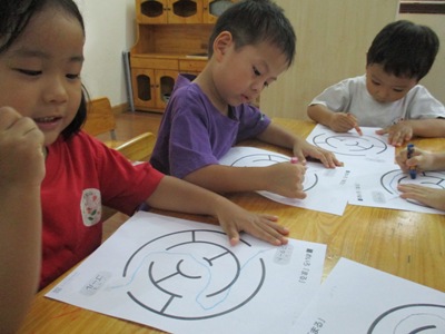 七夕に向けていちご・もも組では彦星と織姫を作りました。 まずは服に『ビー玉ころがし』で模様をつけました。色を選び、絵の具のついたビー玉をトレーの中に入れて… ころころ〜