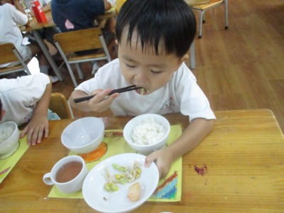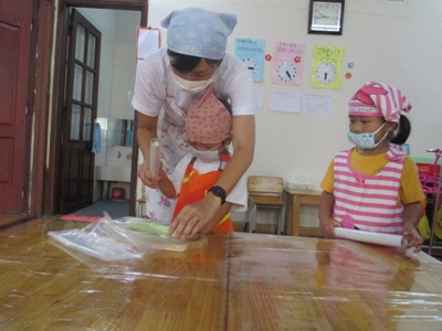 子ども達は2回目のクッキングをとても楽しみにしていました 2回目のクッキングに選んだメニューは、、、 《ささみときゅうりのまぜまぜサラダ》です! 包丁を使わず、簡単にできるサラダです。 エプロン、三角巾、マスクの準備もバッチリOK みんな、ワクワクとっても嬉しそうです! まず、材料の確認です *ささみ *ごま油 *きゅうり *しょうゆ *コーン *しお少々 手も、ピカピカに洗い、消毒してクッキングスタート! ①まずは、きゅうりをサランラップの芯(サランラップを巻いてあります)で、たたきます。 少しずつ順番にたたいていくと、きゅうりに線が入りました。これでOK! 次に、きゅうりを袋から出し、手で小さくしていきます。 「すべるー!」「まだ固いところがあった!」と、 難しい場面でも、一生懸命頑張ります! ②きゅうりの次は、ささみ肉です。 こちらは…「あっ!かんたーん ③小さくしたきゅうりとささみ肉をボールに入れ、コーンを1人ずつ 「おいしくなぁれ♪」のおまじないと共に、スプーンで入れます。 ④そこに、ごま油、しょうゆ、しおを入れると、、、はい完成 冷蔵庫で冷やし、給食の時間を待ちます。 さて、待ちに待った給食の時間 「おいしー」「年長さんも食べてね」と、みんなでおいしく食べました。 クッキング こけし ベトナム・ハノイの日系幼稚園 さくらHoaAnhDao幼稚園ホームページ |